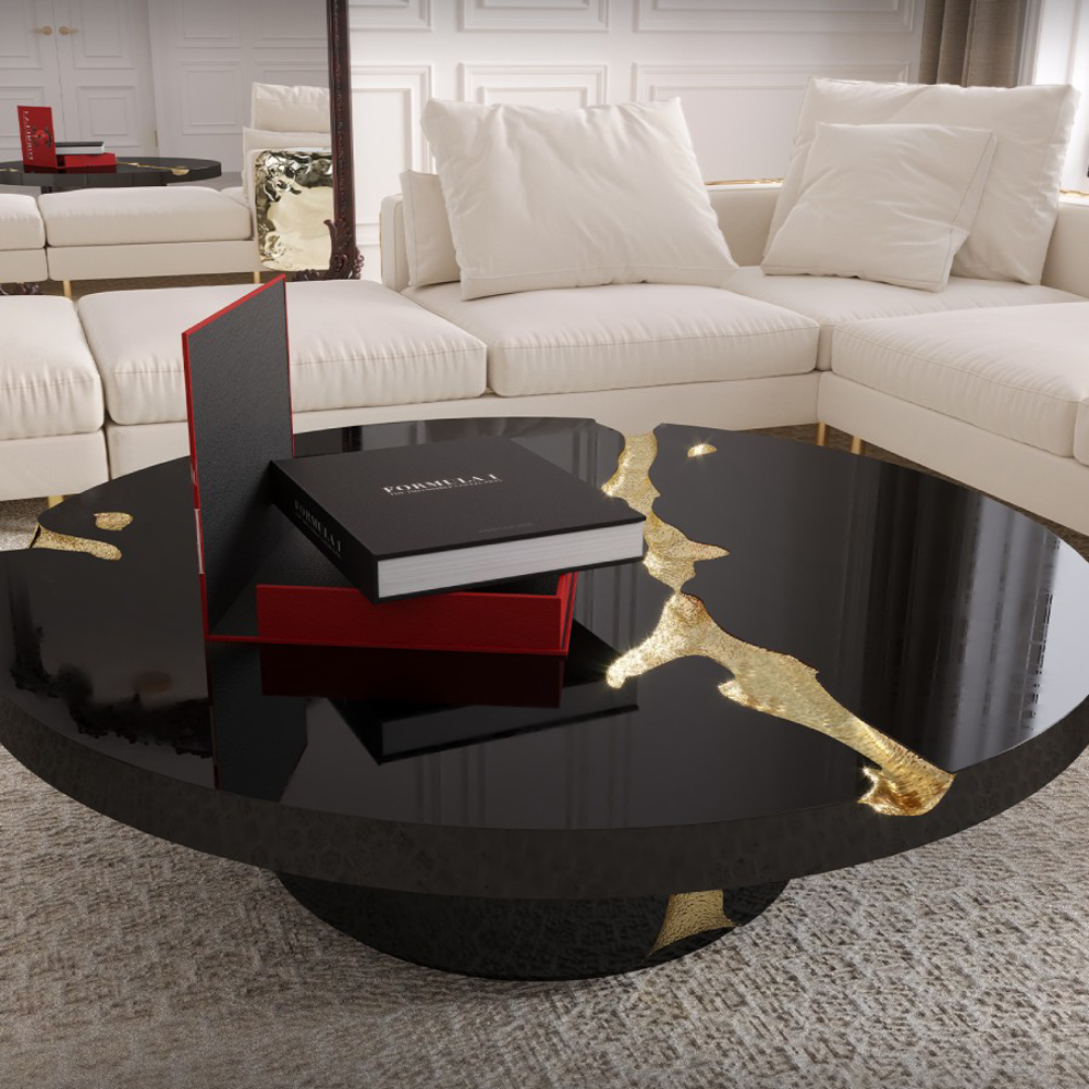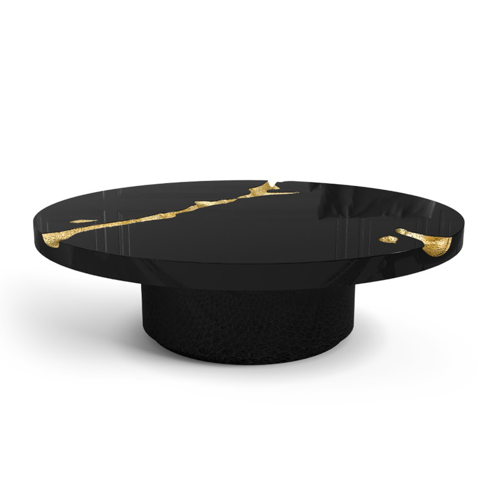 The elegant round center table is built from mahogany wood and features an exquisite polished brass surface detail. Its cracks are hand carved and inserted through polished brass sheets, which are hand hammered for a unique and organic finish. Its finest gold detail crack reflects a gold interior in a manifesto towards power. Flawless and bright, the remaining poplar root surface will raise the bar of the most sophisticated living rooms. Designed and built to make an impression and deliver an unmatched experience, Empire contemporary coffee table is ready to make a statement any occasion.