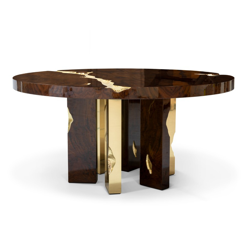 Great Empires take centuries to build, and those who rise after taking a fall find their true strength. It goes without saying that great decisions are taken around powerful tables among determined minds. The Empire dining table symbolizes generations of gatherings and decisions, both in times of celebration or tension. Its cracks reflect tough times, revealing a gold interior in a manifesto towards power. Flawless and bright, the remaining surface points towards a thriving future, reminding one to toast to prosperity.