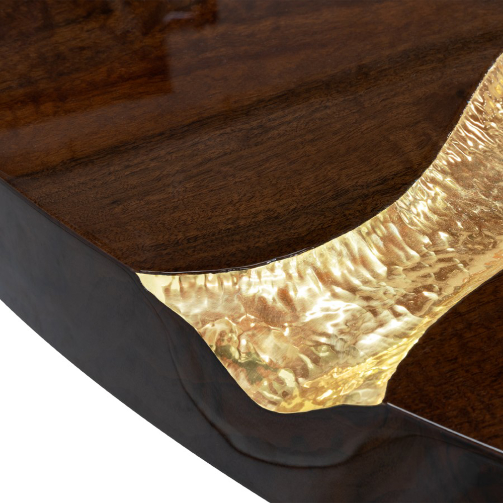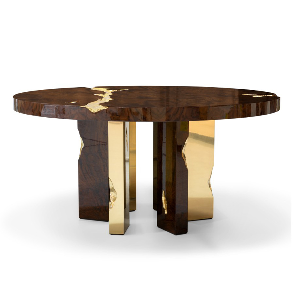 Made in wood and polished brass, this upscale round dining table is an elegant composition of two scaled organic brass tubes. It incorporates richest nature-inspired design, industrious welding techniques and a manually engraved top that emulates the outlines of log rings, reminding the timeline of a tree.