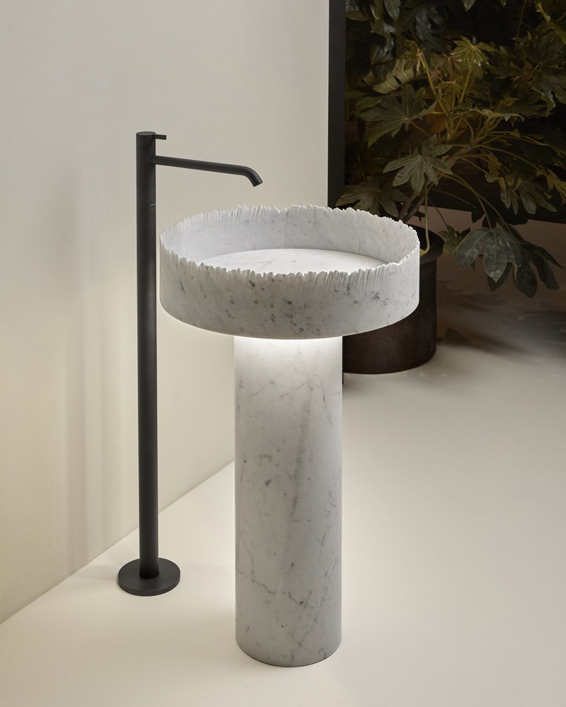 The functional element thus becomes a distinctive feature of the design, a simple but precious detail that identifies a style, defines the personality of the mixer, and tells a character that is transmitted to the entire washbasin area. In the floor-standing version, the mixer can be accessorized with a small shelf that integrates into the column and allows for the placement of accessories and objects of daily use.