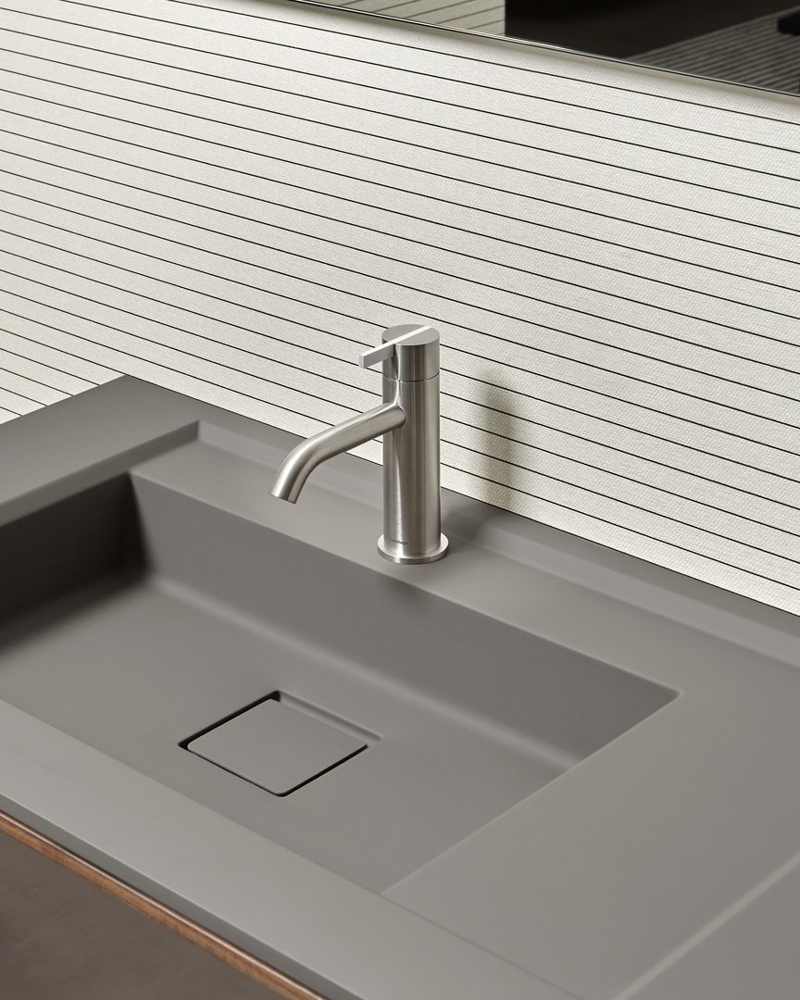 The pure geometries of the cylinder that define the body, spout and knob, the clean, square lines of the lever that engages it with a disruptive gesture, a clean, decisive cut but at the same time measured and in harmony with the overall image of the mixer. Essentia is the tap collection that combines minimalism and performance, measured proportions and dimensional balance with features of sustainability, hygiene and durability. Made entirely of stainless steel, Essentia is available in satin or polished finishes but also in a matt lacquered version, while the mixer lever can be customized in all the colors of the antoniolupi range.