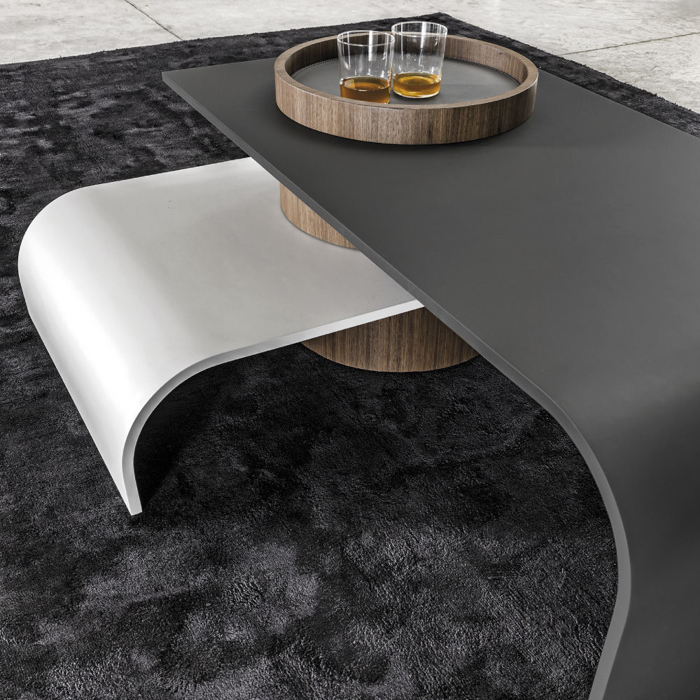 The Etna coffee tables is a contemporary collection of cocktail table featuring curved and cylinder wood. The magazine rack with saddle top is a real statement piece. Available in all MC colors