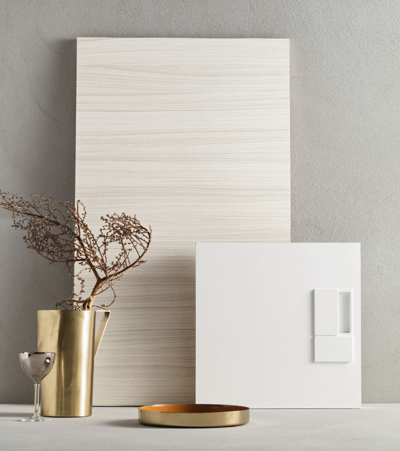 The Ice Collection is available in two finishes: "Ice Supermatt" lacquered, a shade of white that is extremely opaque and velvety to the touch and "Palissandro Bianco", which reproduces the texture of the veins in a light gray tone.