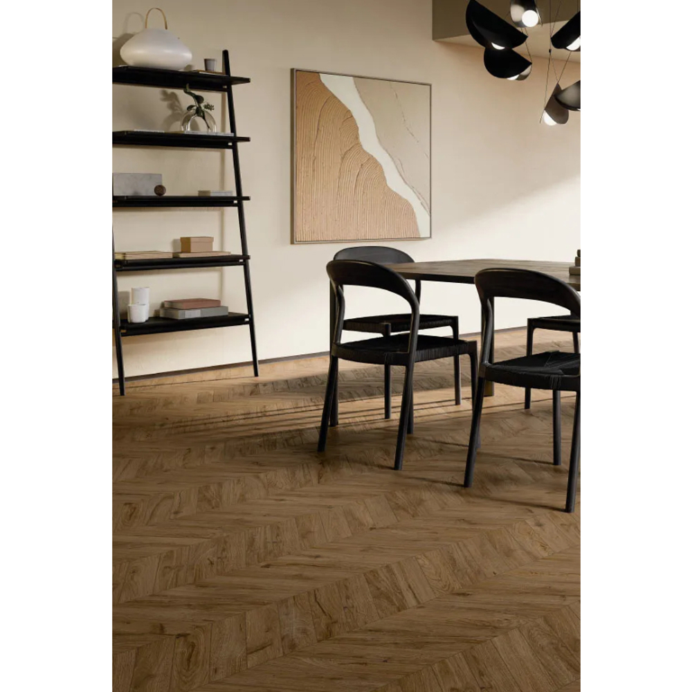 Smoke brings timeless elegance and vintage charm to interior spaces. Its natural wood tones and subtle texture create a sophisticated, warm atmosphere, perfect for floors and wall coverings. When laid in a chevron pattern, Smoke adds dynamic movement and modern character to any room, elevating its aesthetic appeal.