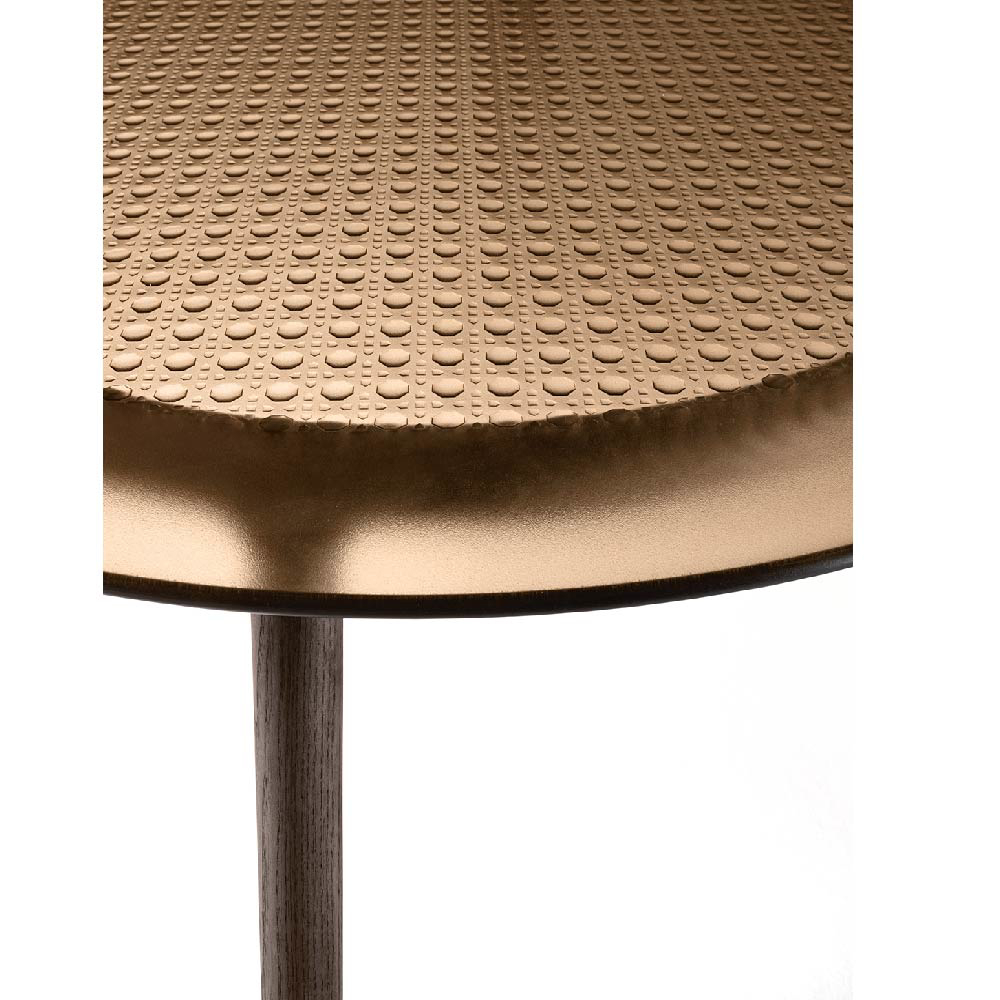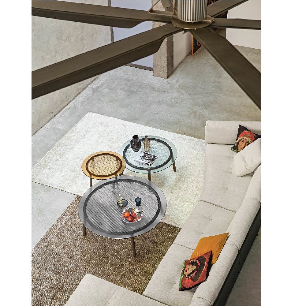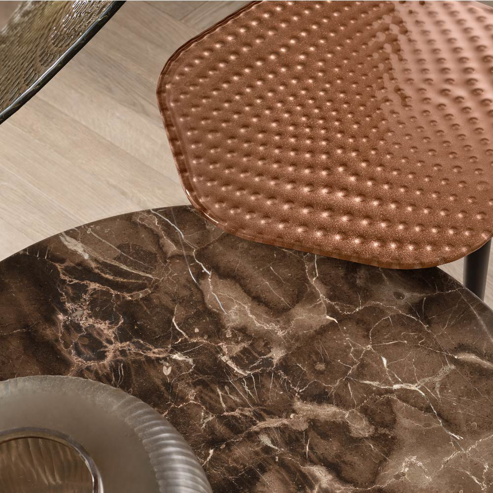 Emmanuel Gallina Coffee table with 0.39” tempered and fused glass top with “Cannage” texture, available transparent or back-painted with semi-transparent finishes or with metallic paints. Top available also in marble. Solid wood structure in tobacco finish.