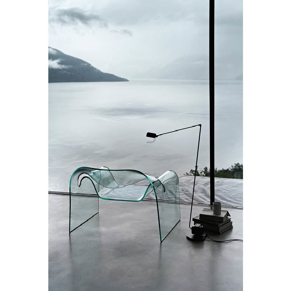 Monolithic chair in 0.47” thick curved glass.