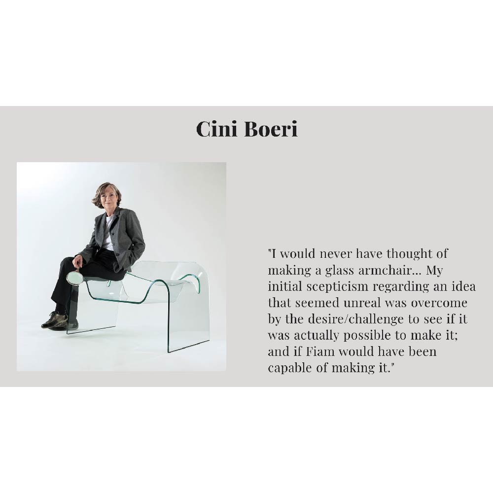 Cini Boeri is the designer of FIAM Ghost chair in curved glass, an icon of design worldwide and on display at Moma in New York.
