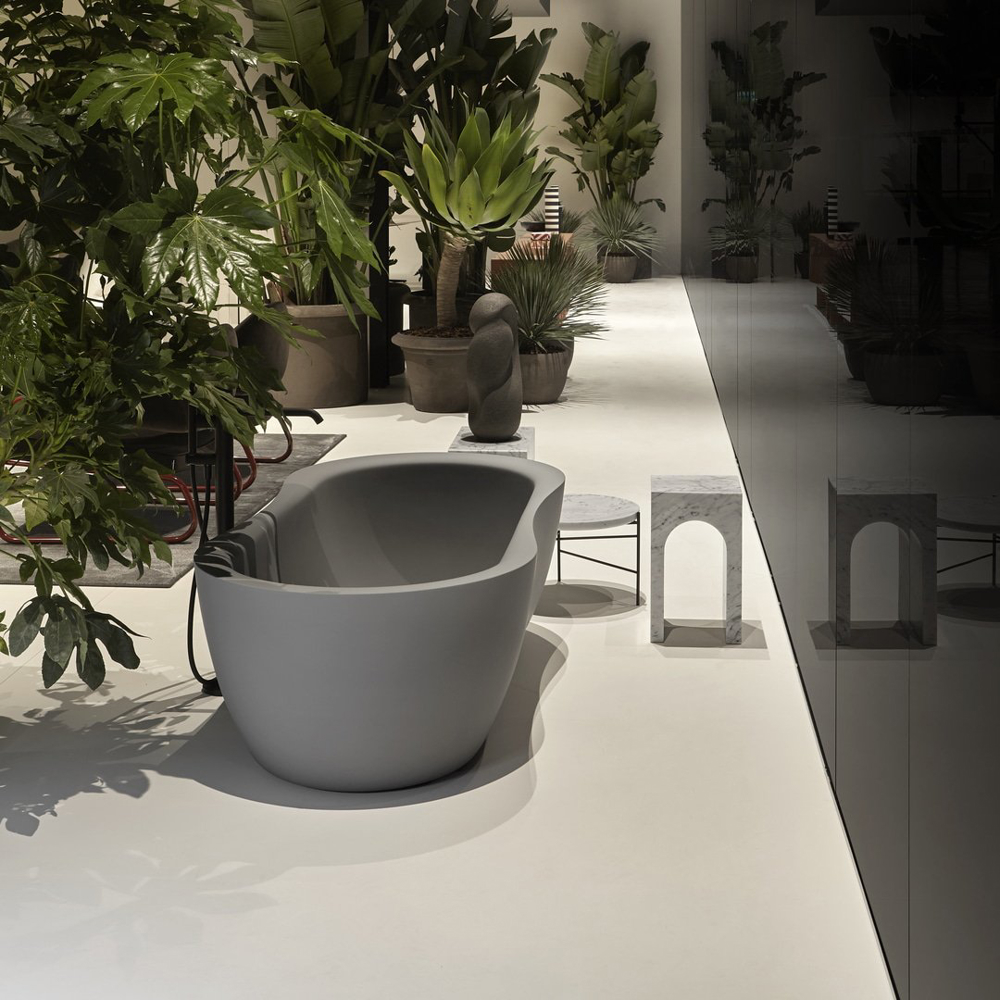 The Fida bathtub is inspired by nature. The outer line takes its cue from the organic shapes of river woods, which give the piece a feeling of fluidity. The edges are beveled and the lines soft. The interior of the bathtub is an ergonomically designed to envelop and give comfort to those who immerse themselves within. Like a real sculpture, carved from a monolith, it is available in various versions of stone and marble, materials that emphasize the idea of a concept related to nature.
