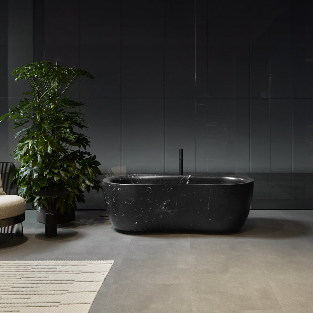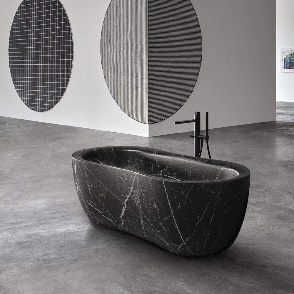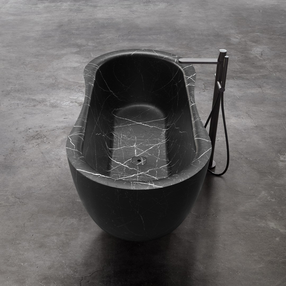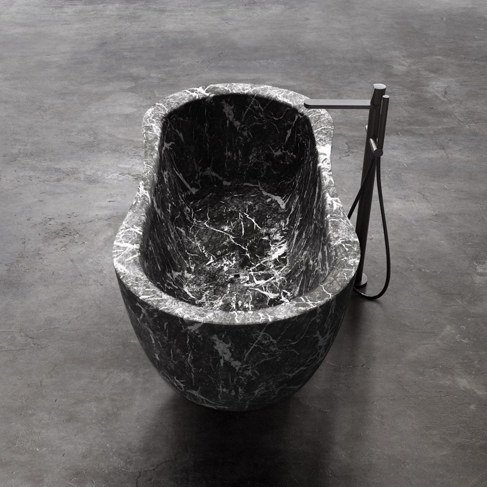 The Fida bathtub is inspired by nature. The outer line takes its cue from the organic shapes of river woods, which give the piece a feeling of fluidity. The edges are beveled and the lines soft. The interior of the bathtub is an ergonomically designed to envelop and give comfort to those who immerse themselves within. Like a real sculpture, carved from a monolith, it is available in various versions of stone and marble, materials that emphasize the idea of a concept related to nature.