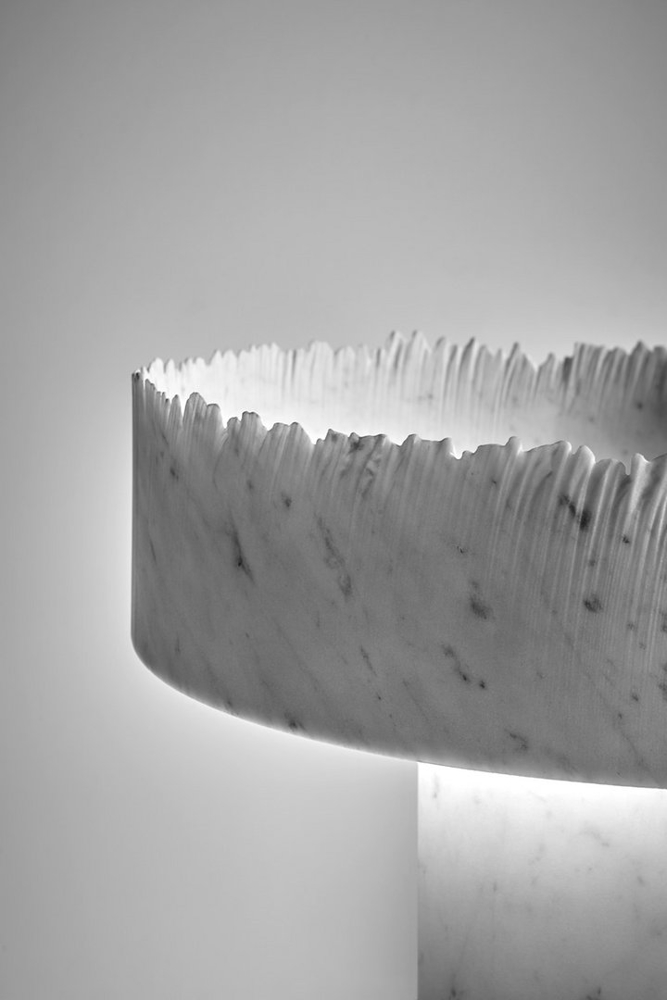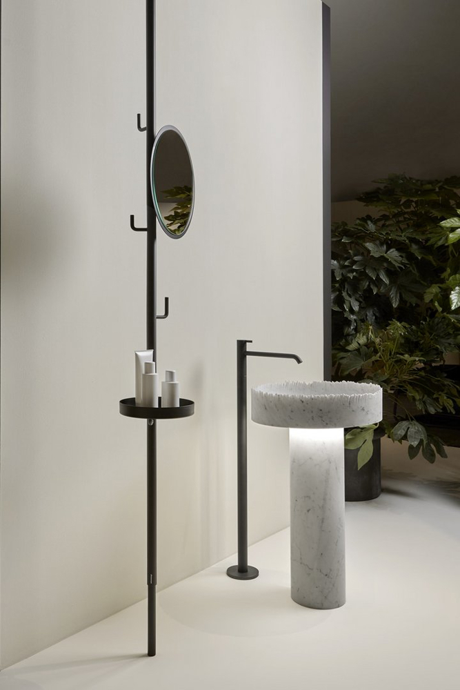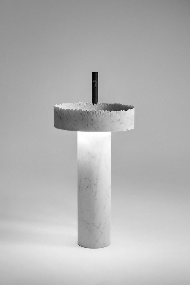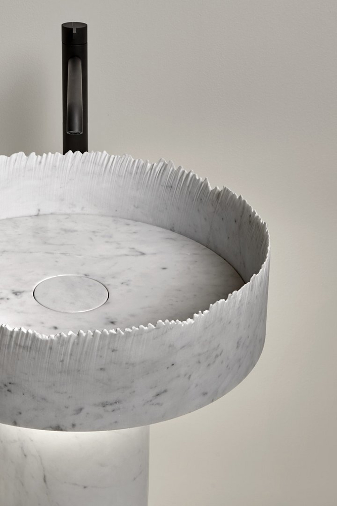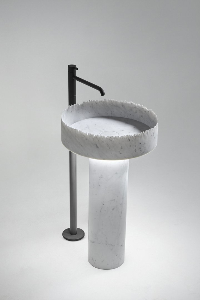 Flow becomes the interpreter of the intense dialogue between water and matter, the sink crystallizes a very precise moment and refers to the randomness of the encounter between natural elements. The rough edge gives dynamism to the sink and contrasts the perfectly smooth surface of the cylindrical column on which the basin rests, which in the part below can integrate the light source. A detail that allows the base to be illuminated and accentuates the feeling of lightness and upward momentum that characterizes the image of the sink.