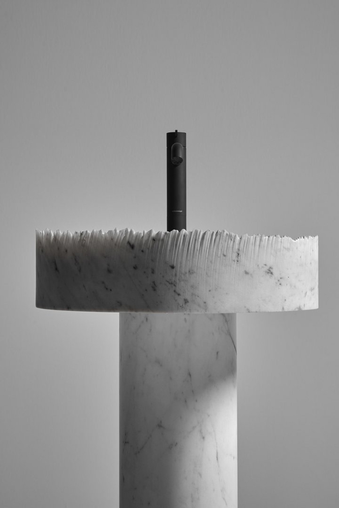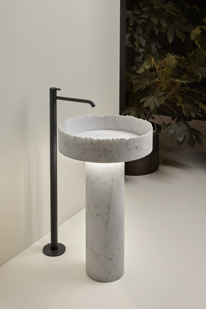 Flow becomes the interpreter of the intense dialogue between water and matter, the sink crystallizes a very precise moment and refers to the randomness of the encounter between natural elements. The rough edge gives dynamism to the sink and contrasts the perfectly smooth surface of the cylindrical column on which the basin rests, which in the part below can integrate the light source. A detail that allows the base to be illuminated and accentuates the feeling of lightness and upward momentum that characterizes the image of the sink.