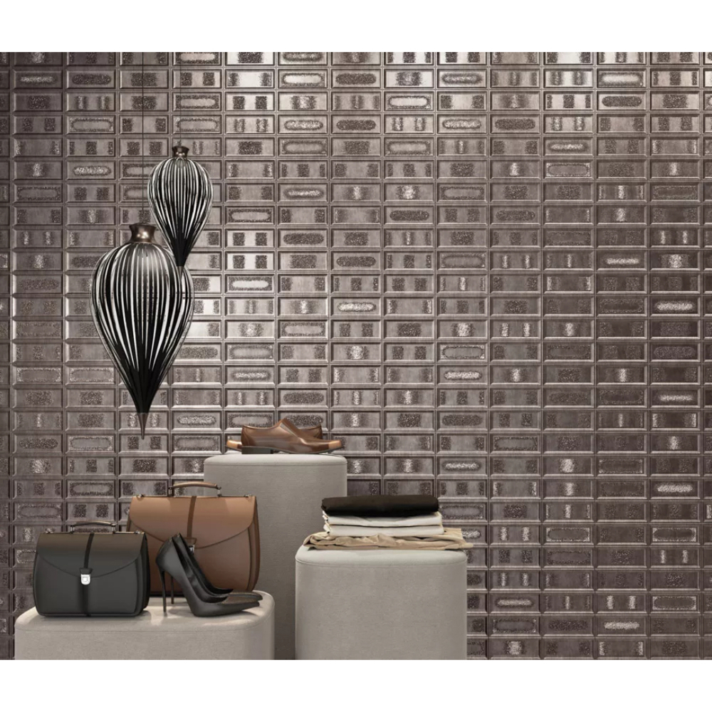- 20”x40” with embossed brick reliefs and tonal gradients for depth and modern character