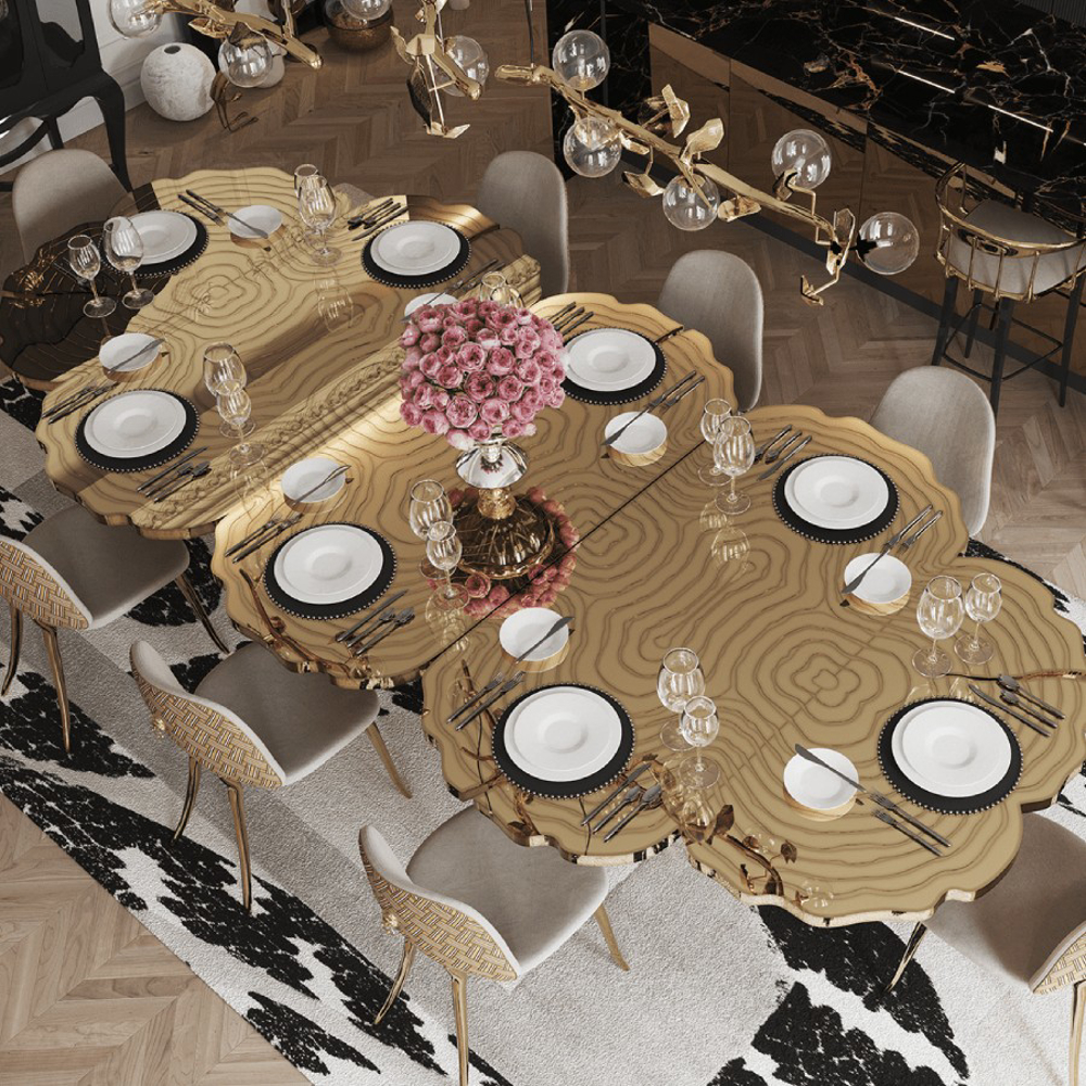 Made in wood and polished brass, this upscale dining table incorporates richest nature-inspired design, industrious welding techniques and a manually engraved top that emulates the outlines of log rings, reminding the timeline of a tree. Below the expansive 8 seat dining table top is an elegant composition of two scaled organic brass tubes.