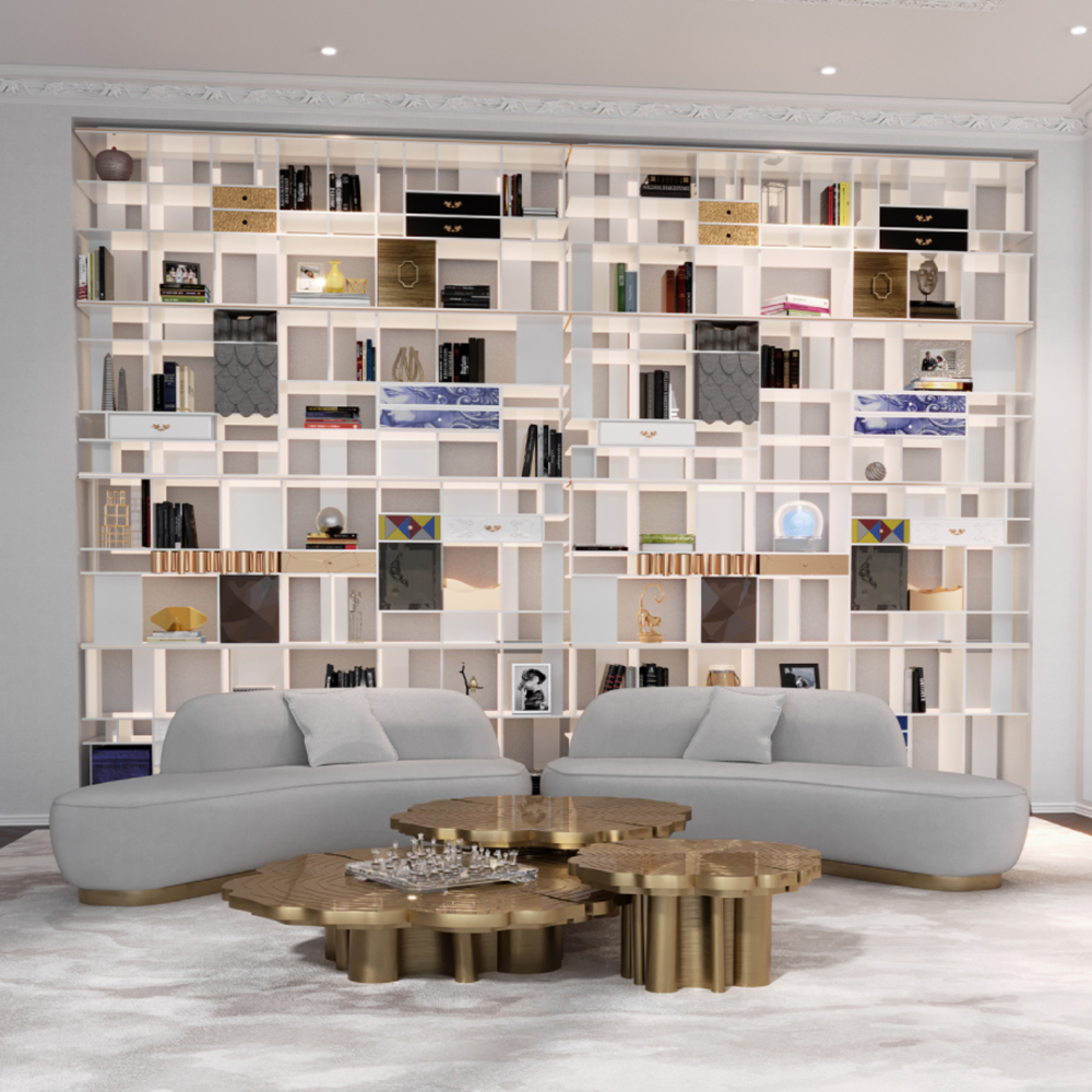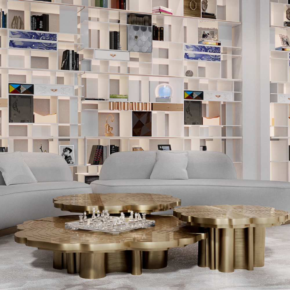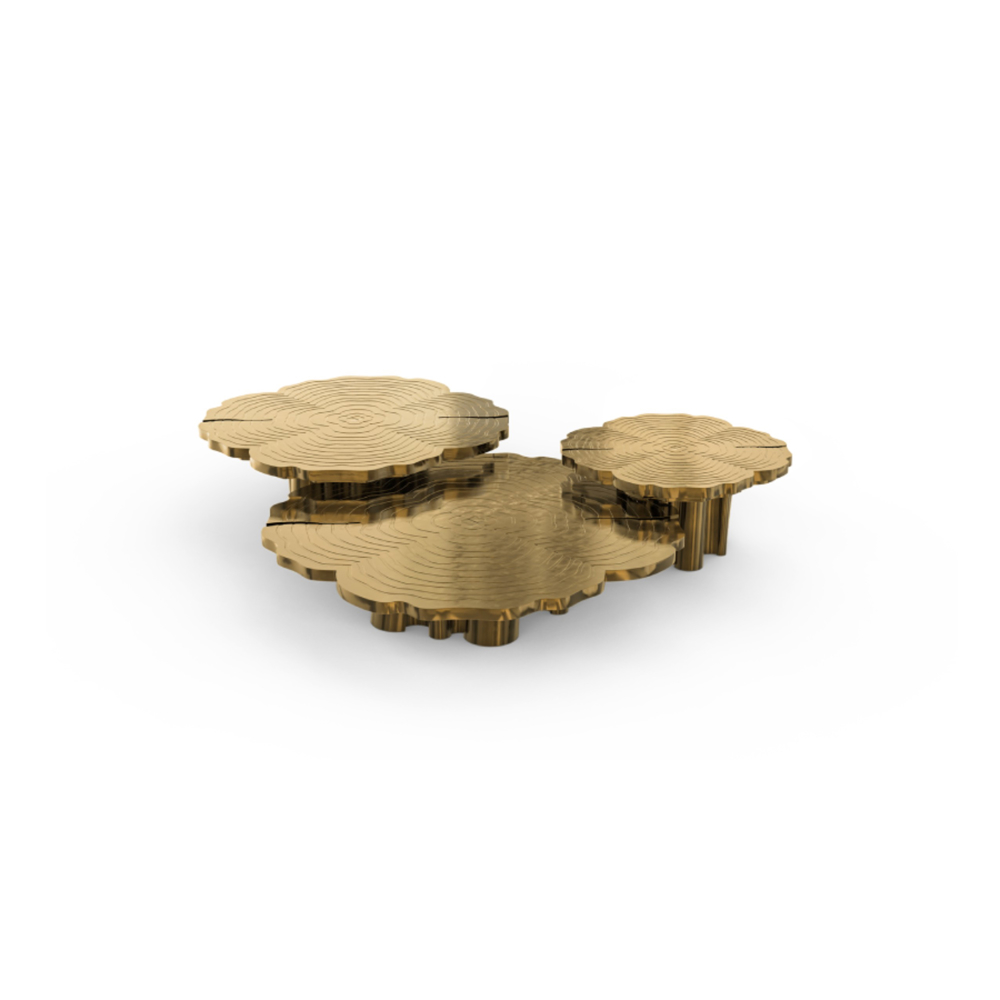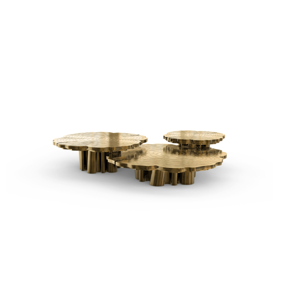 A center table made with polished brass and with three different tops in different levels. . It's finished with gloss varnish.