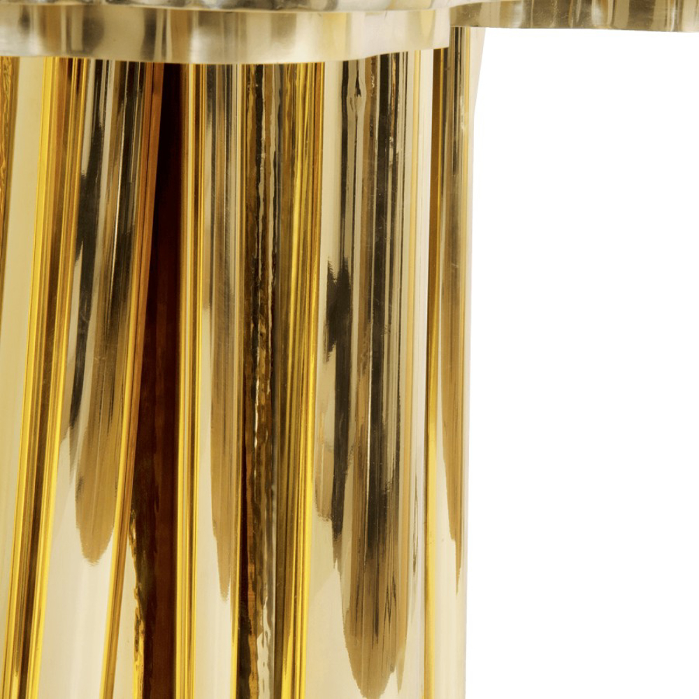 Made in wood and polished brass patina, this upscale dining table incorporates richest nature-inspired design, industrious welding techniques and a manually engraved top that emulates the outlines of log rings, reminding the timeline of a tree. Below the expansive 8 seat dining table top is an elegant composition of two scaled organic brass tubes.