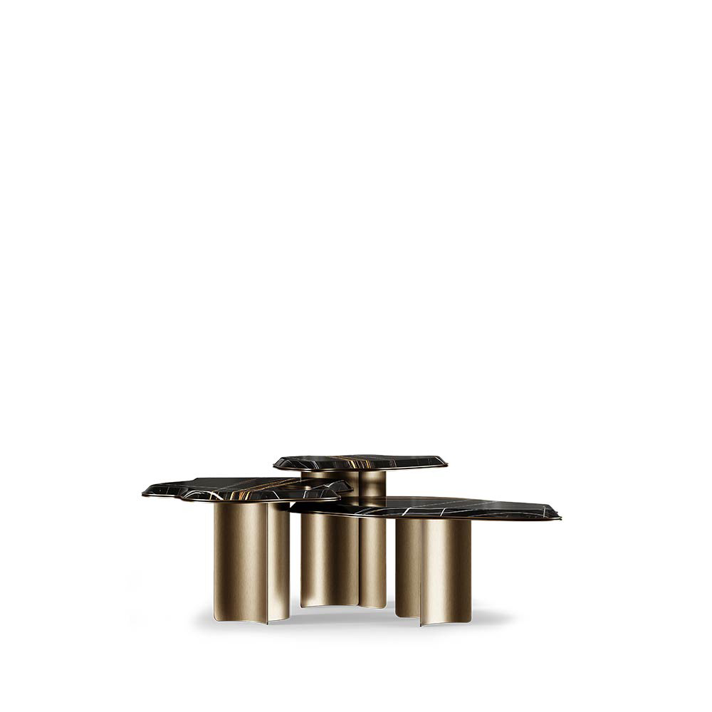 Materials and Finishes: Sahara Noir Marble and Aged Brass with Translucent Patina.