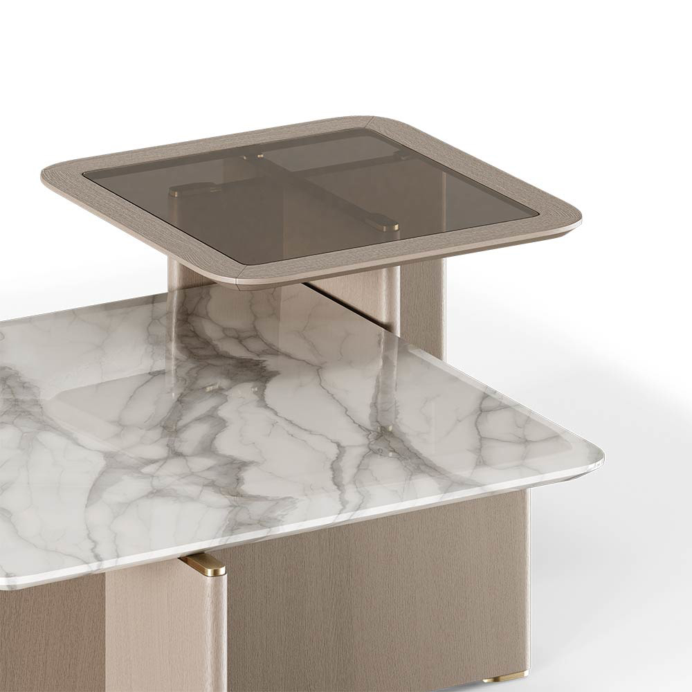 DIMENSIONS W 116 cm |45,67’’ D 108 cm | 42,52’’ H 50 cm | 19,69’’ Materials and Finishes: Oak Veneer, Smoked Glass, Carrara Marble and Aged Brass. Customization: Custom sizes and colours are available under consultation. WEIGHT 90 kg | 198,42 lbs