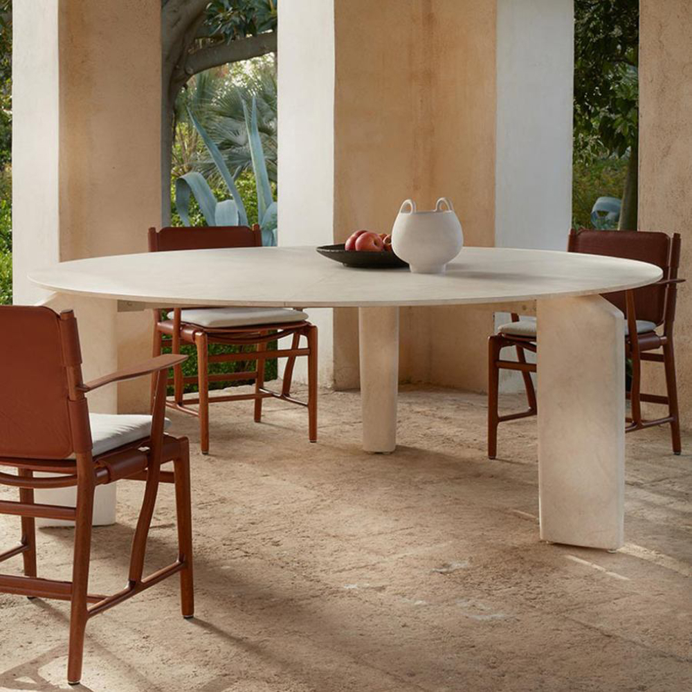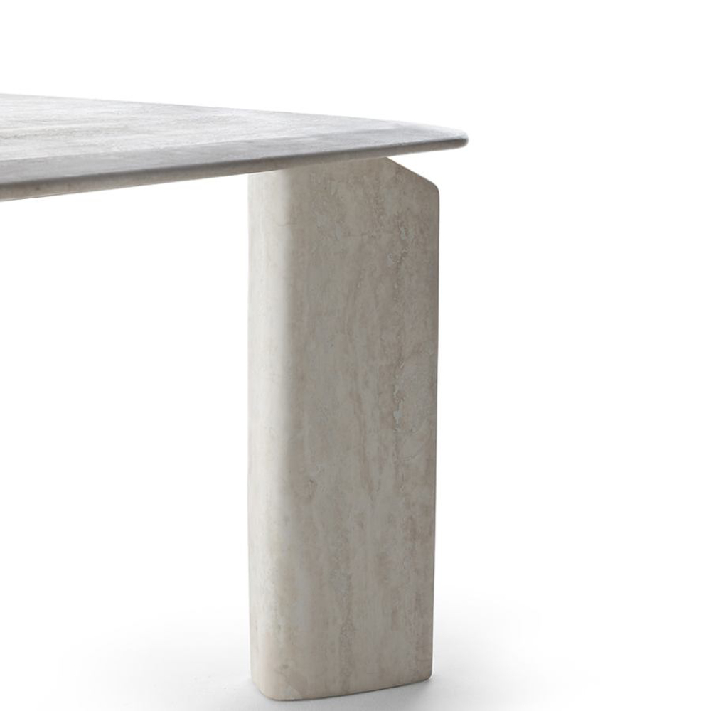 Made entirely of marble, Giotto Table's structure makes use of sinuous contrasts. The wide and tapered circumference with its monolithic and imposing legs, are joined to the top by bevelled geometries.