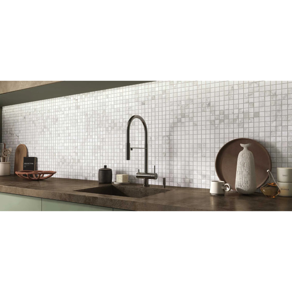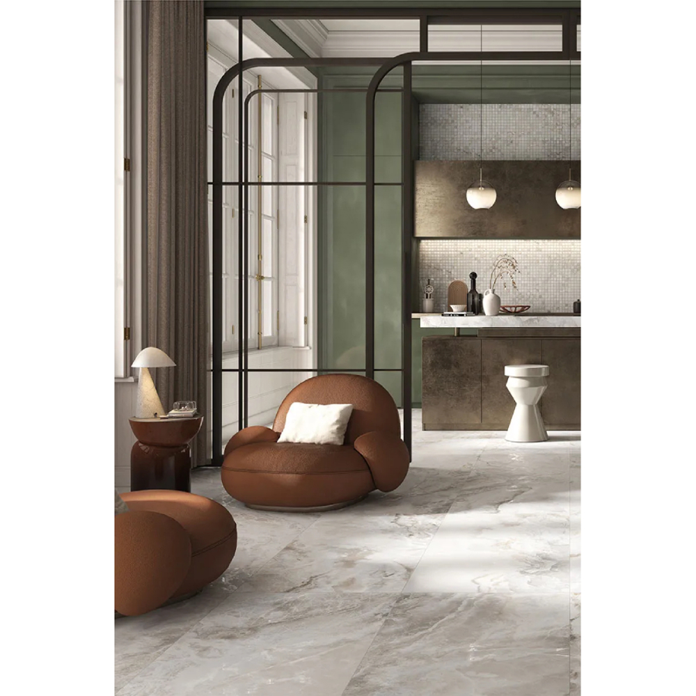 Onice Grey is ideal for floor and wall applications, adding a dimension of sophistication, luxury, and style to both residential and commercial interiors. Its versatility allows it to complement a variety of furnishing styles, enhancing spaces with refined elegance while benefiting from the durability and practicality of porcelain stoneware.