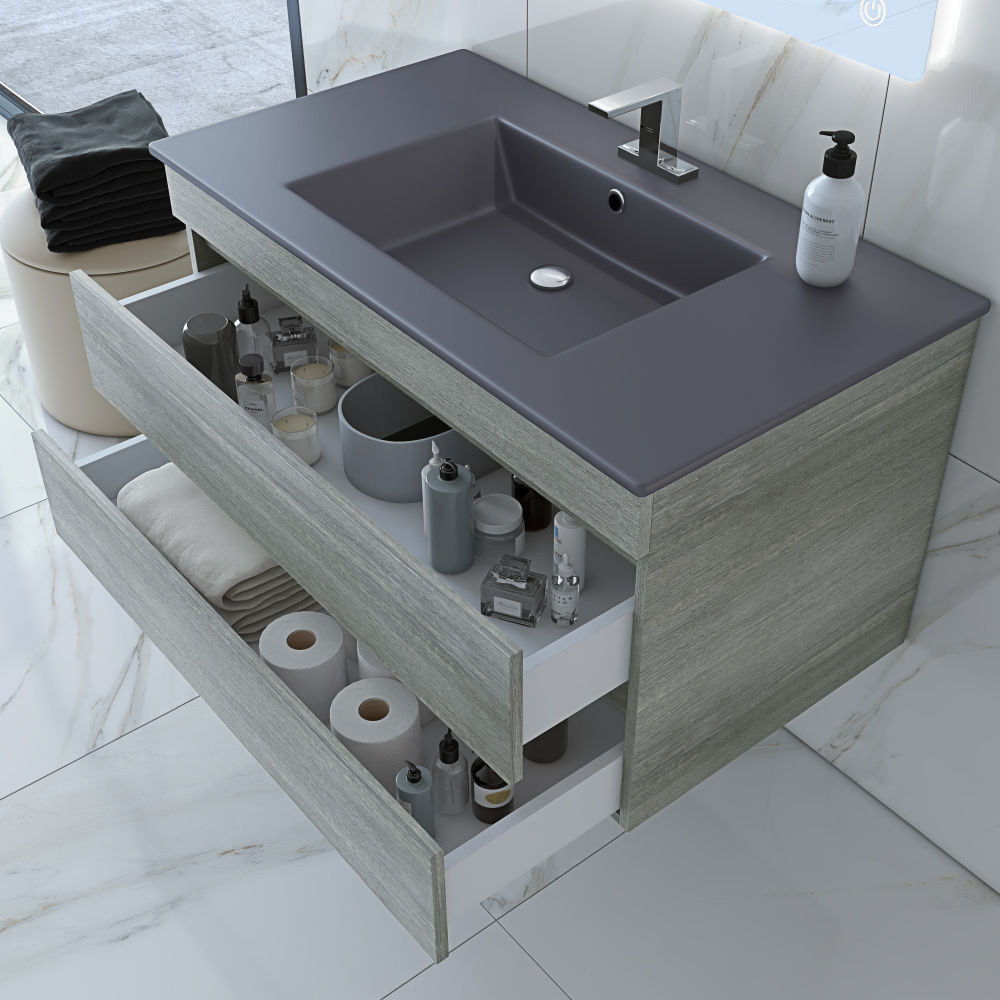 This artful and stylish Legnori bathroom vanity gracefully showcases a contemporary silhouette combined with a minimalist, eye-pleasing design. It gives your bathroom a relaxed and serene look. Still looking compact and slim, when we talk storage, its two soft-closing drawers offer extensive space for toiletries, towels, and other bathroom accessories. The vanity can (optional) come with a high-end quality engineered stone countertop that seamlessly flows into a perfect drop-in sink.Â