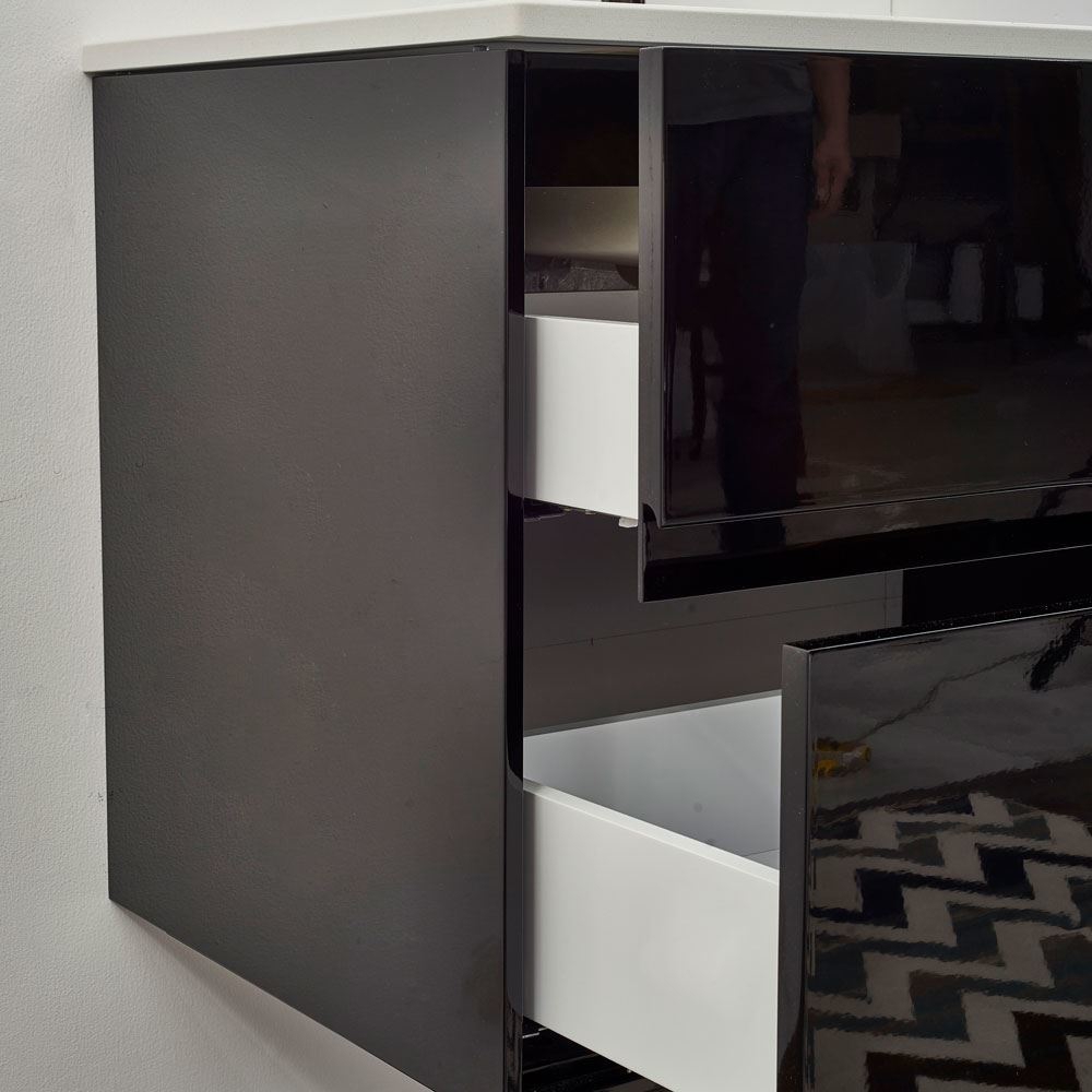 It is designed to complement any bathroom interior with its high glossy black finish, uniquely designed handles and space drawers, which are ideal for keeping your daily essentials.