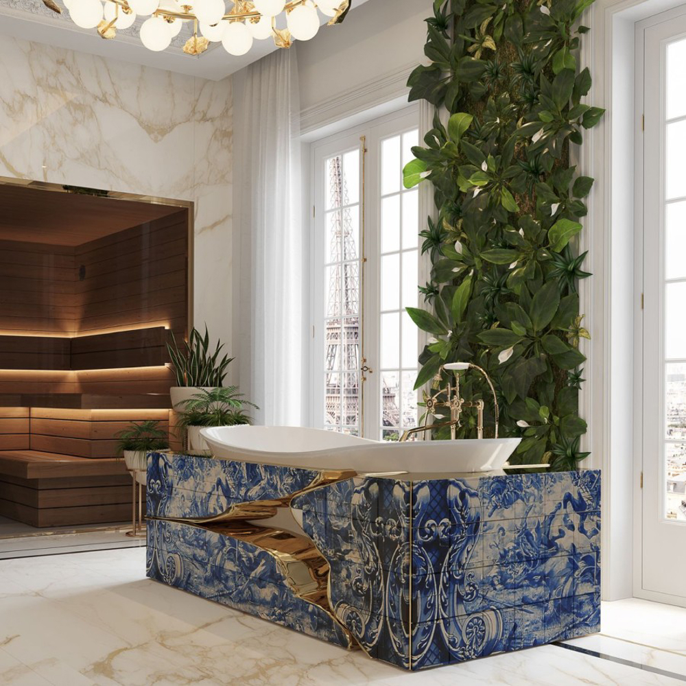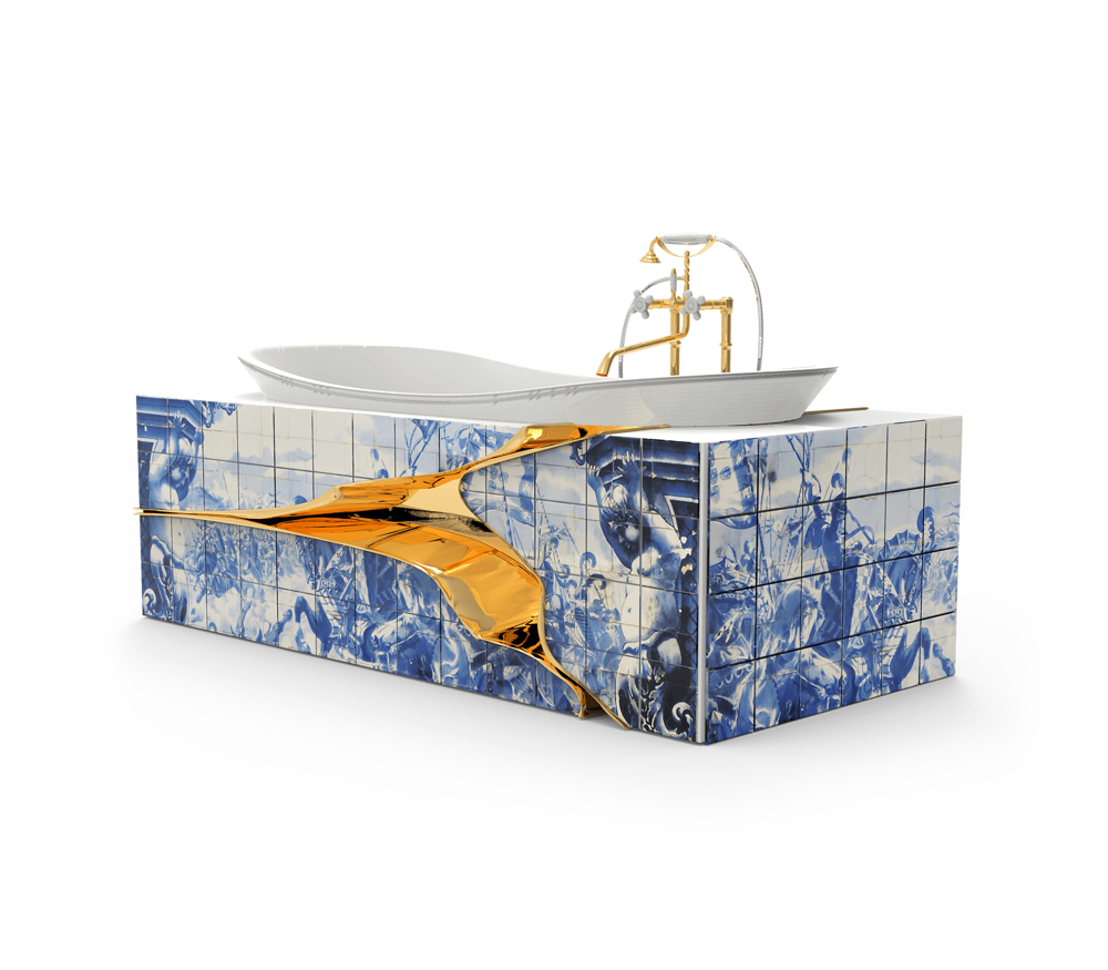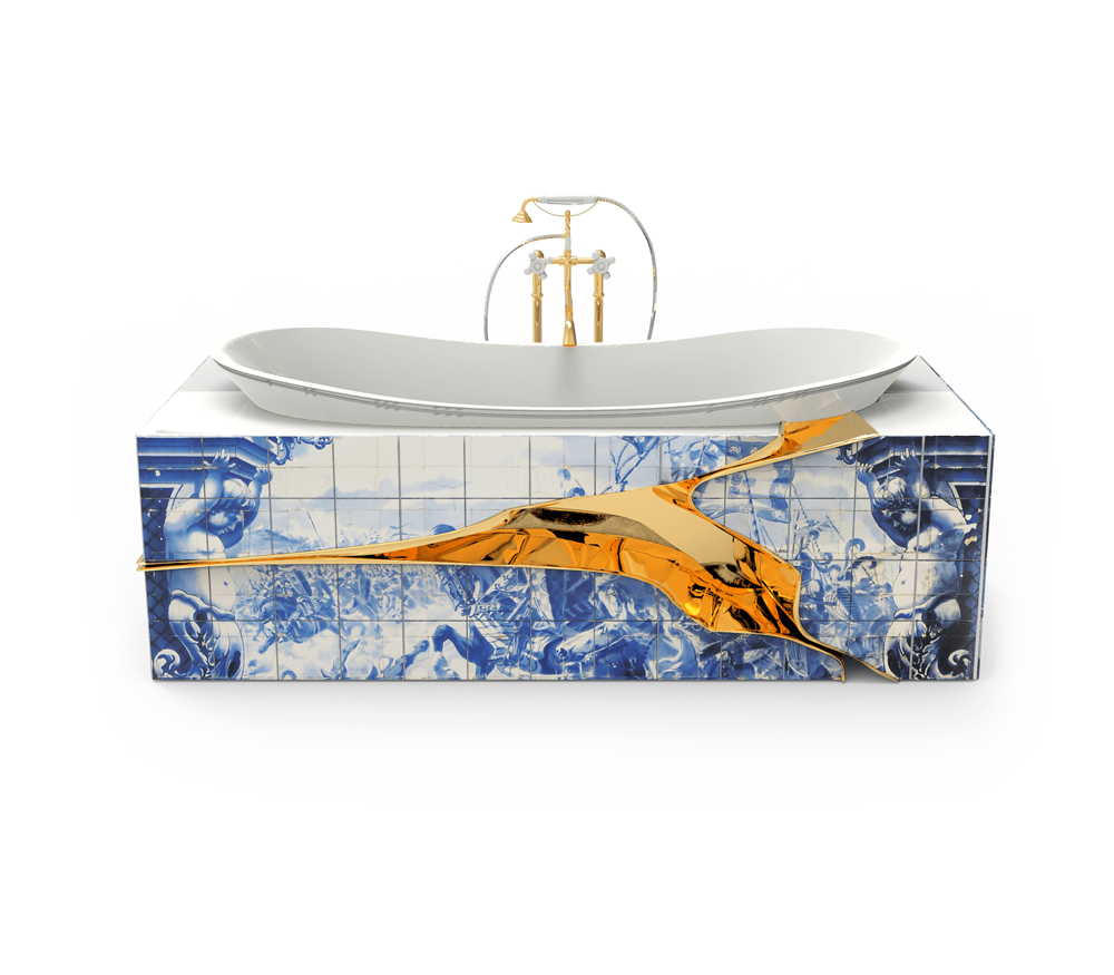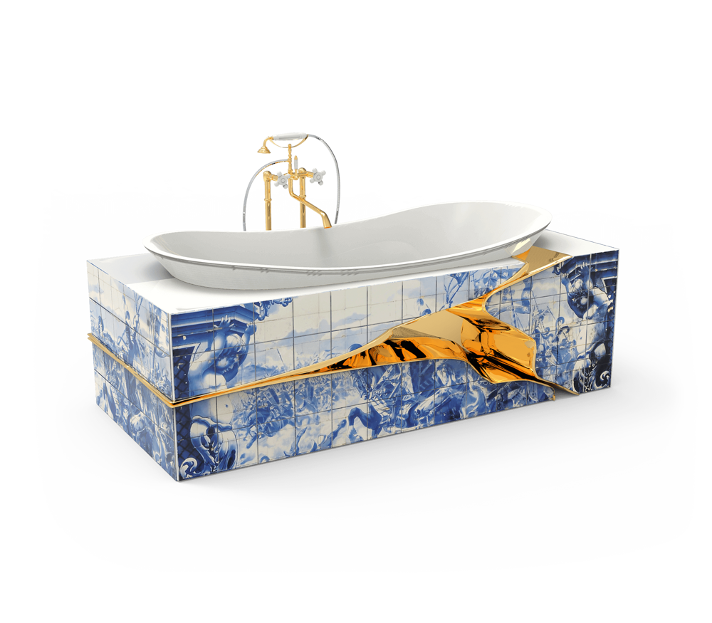 Hand-painted tiles, fiberglass, cast iron, gold paint, high gloss varnish.