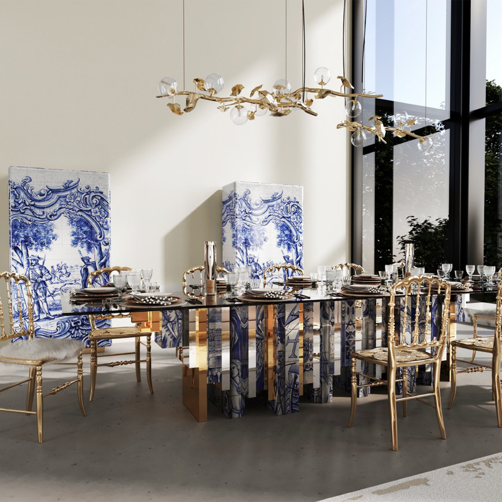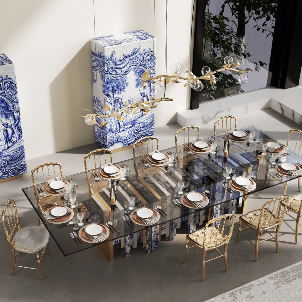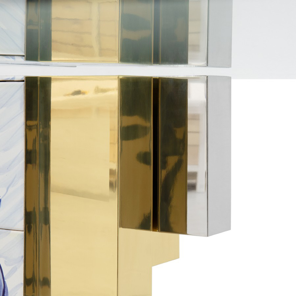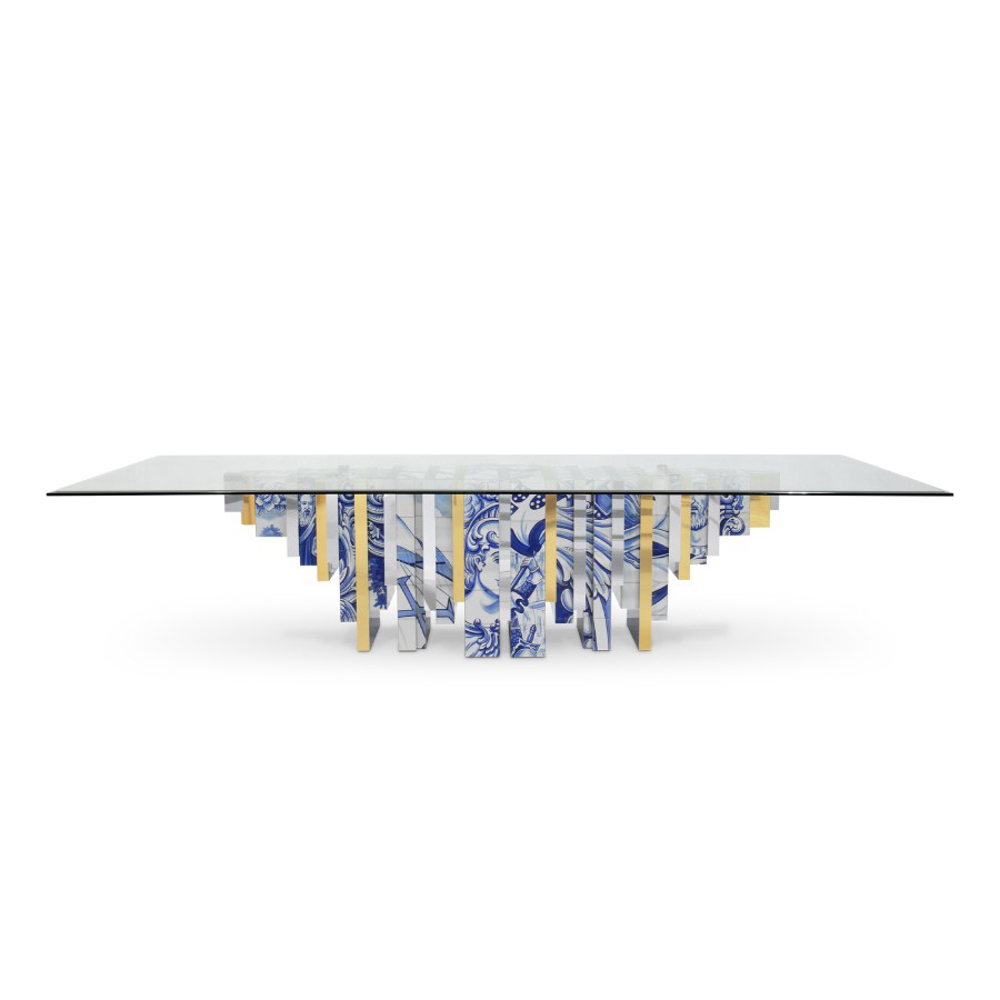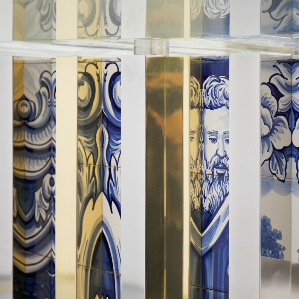 Table lined with hand painted tiles and modules of wood composed by polished brass and beveled mirror.