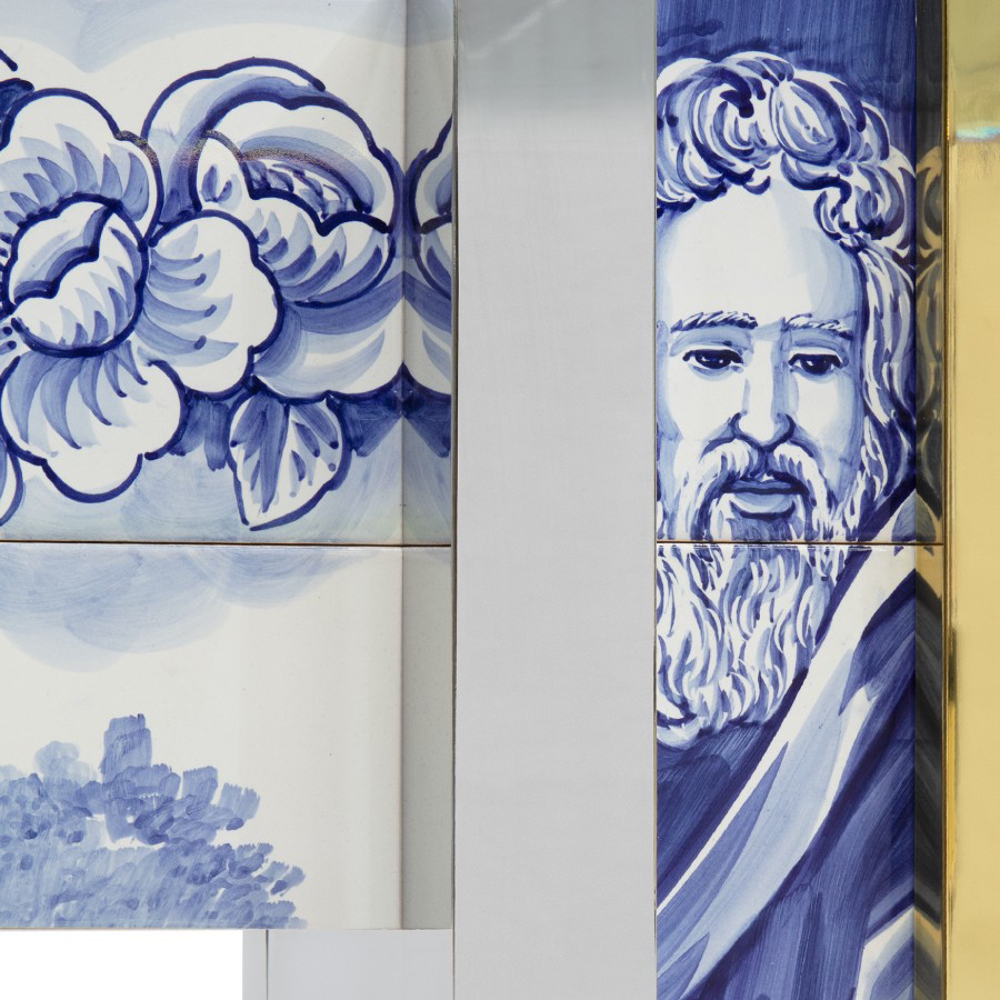 Hand painted tiles, Tempered glass, Beveled mirror, Polished brass.