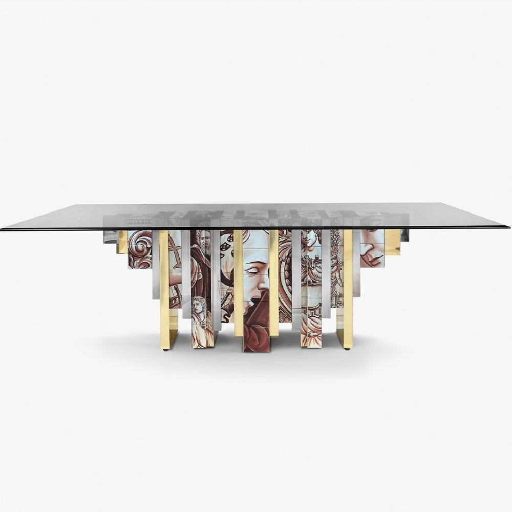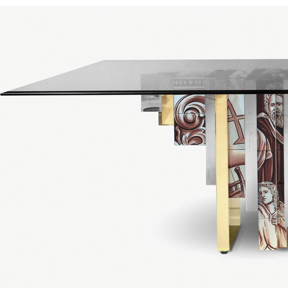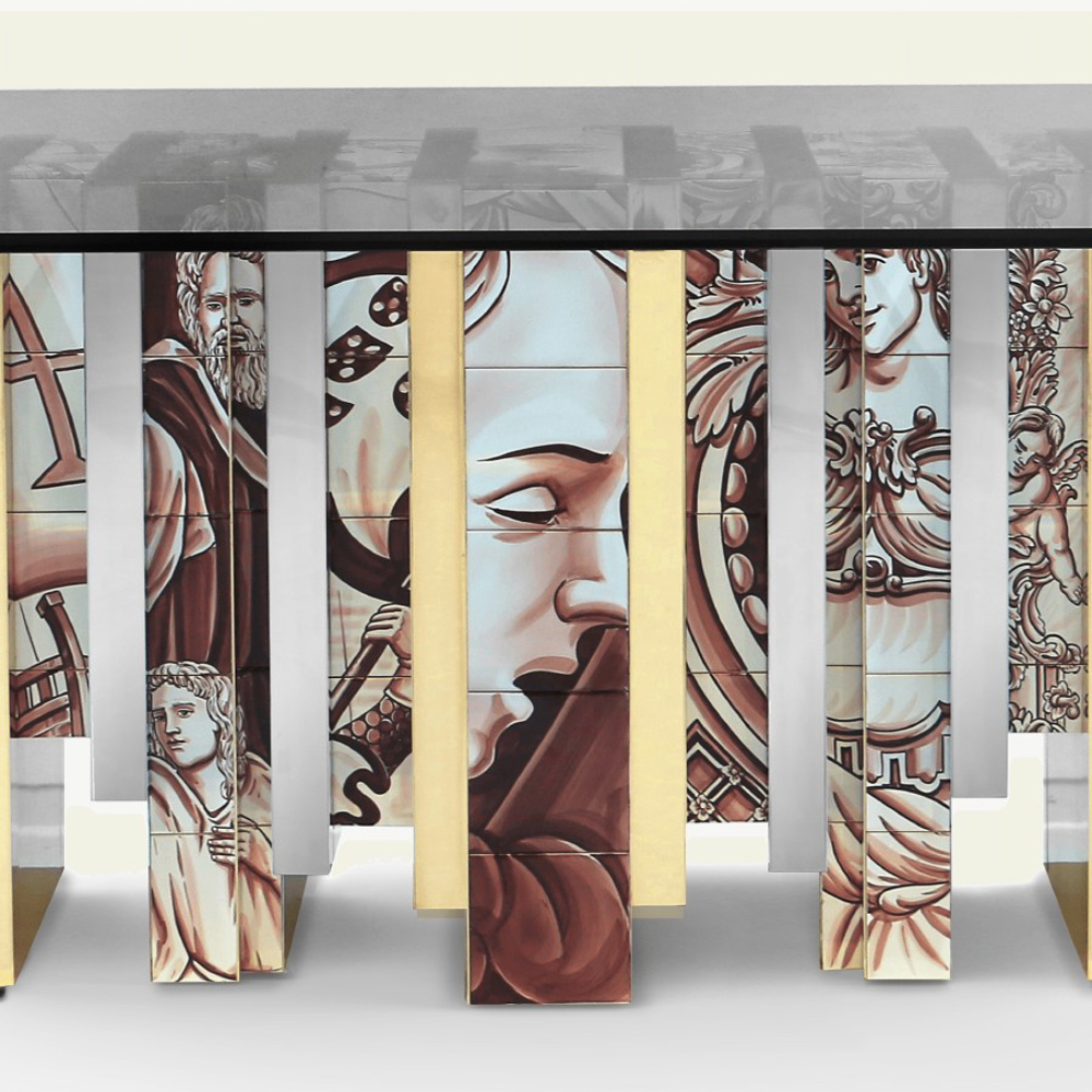 Table lined with hand painted tiles and modules of wood composed by polished brass and beveled mirror.
