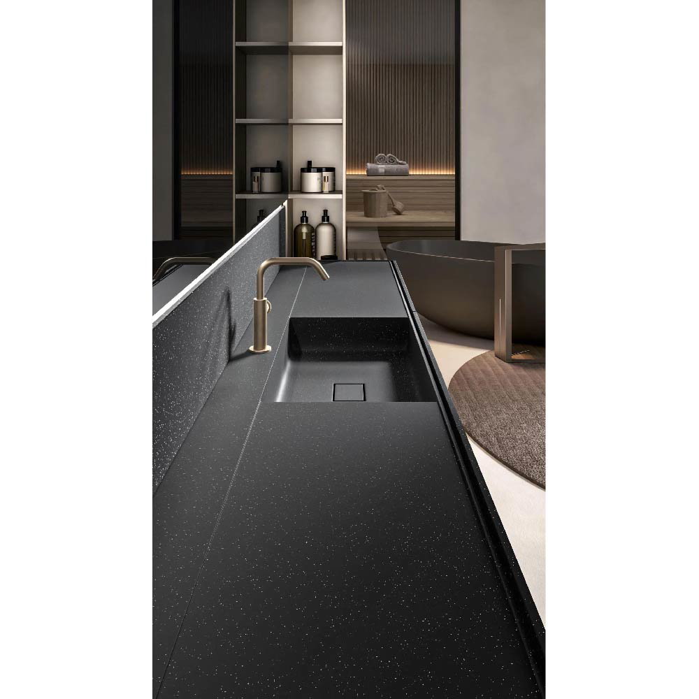 Part of the Hexis project is the new washbasin. The line is clean, essential. Rectangular design, to give the best even in reduced depth, reveals the best details in profile: completely housed under the profile of the door, the front edge, cut to 45# becomes a distinctive feature and space for the opening. Note the rear drain channel and the width of the tank all mobile. Available in depth 15.75" and 19.69".