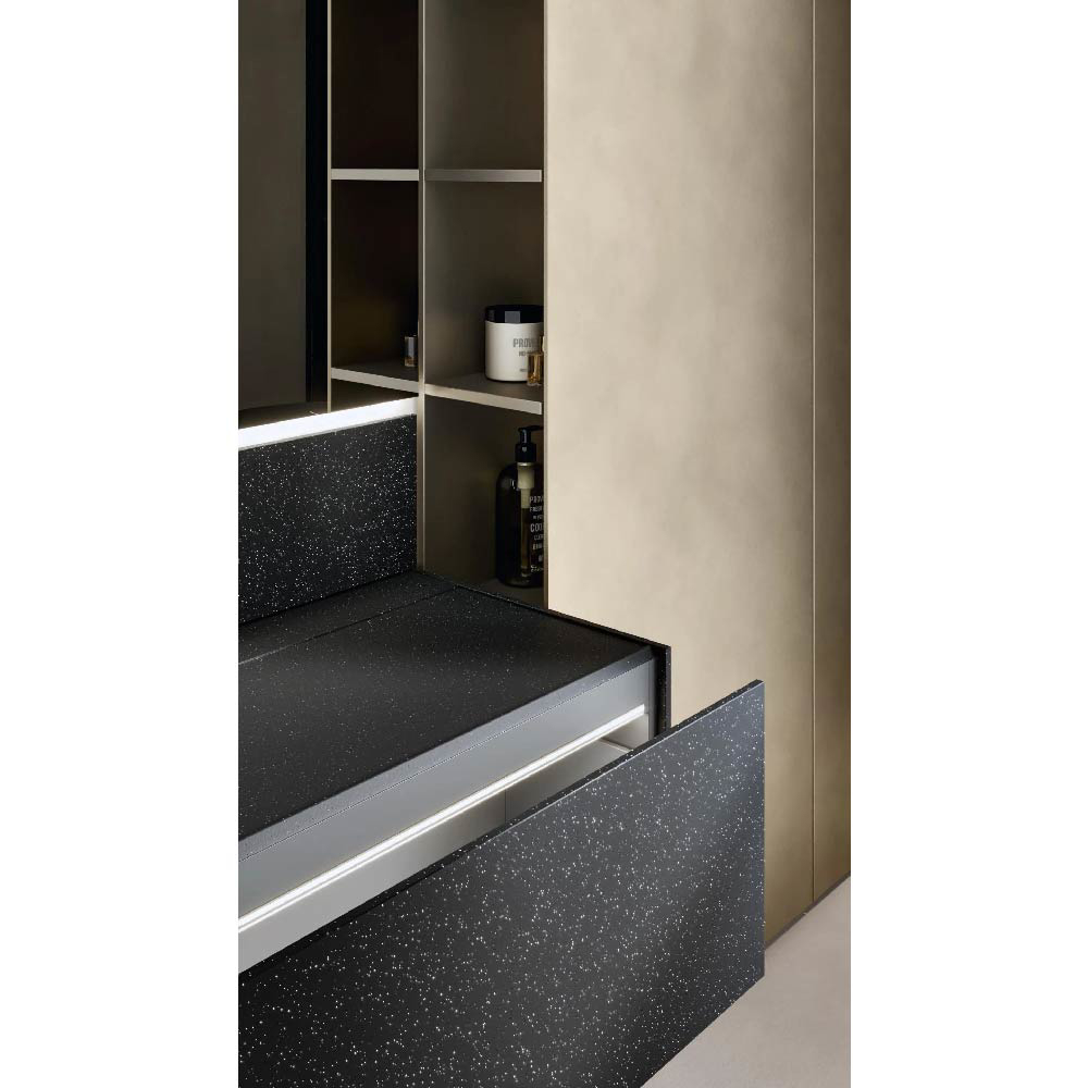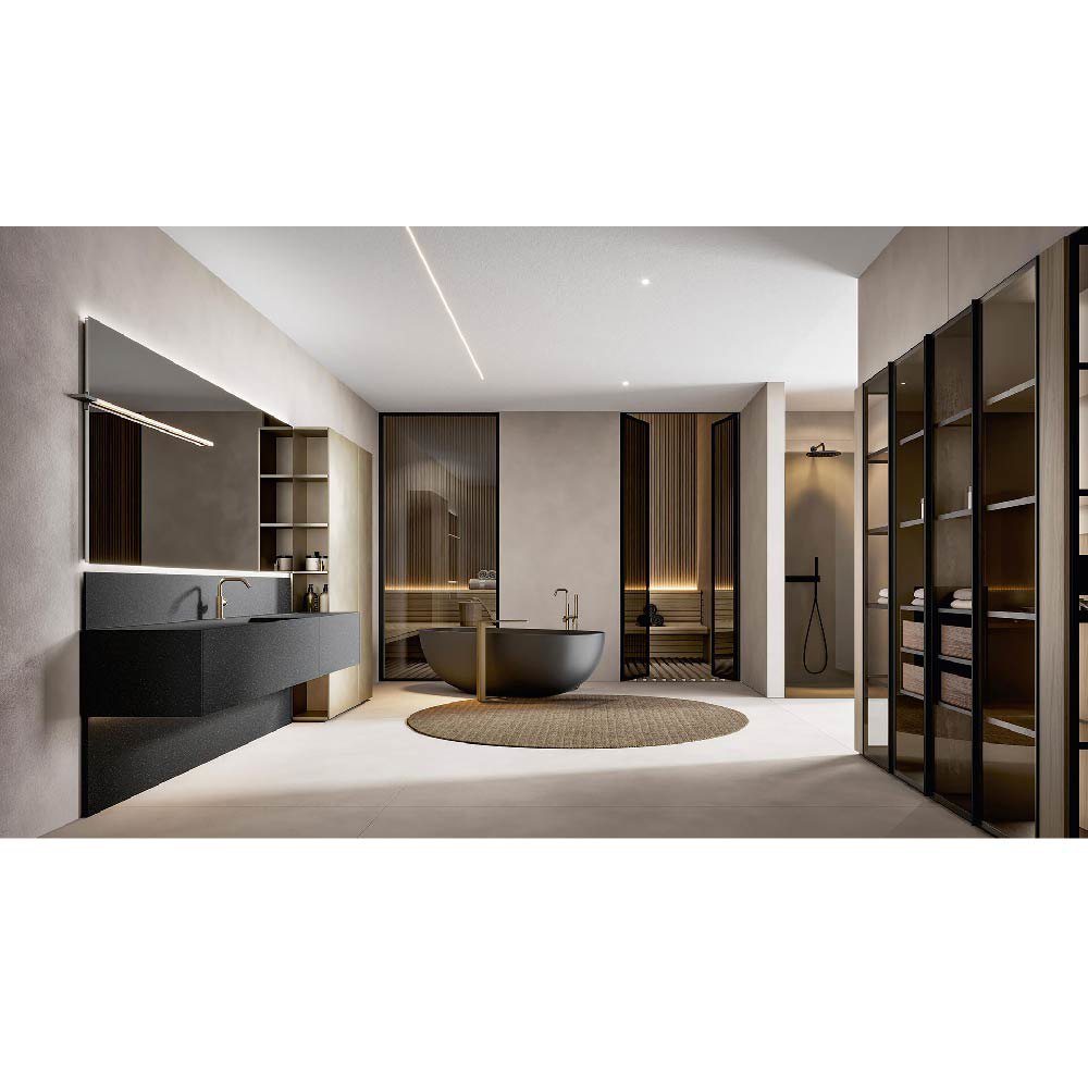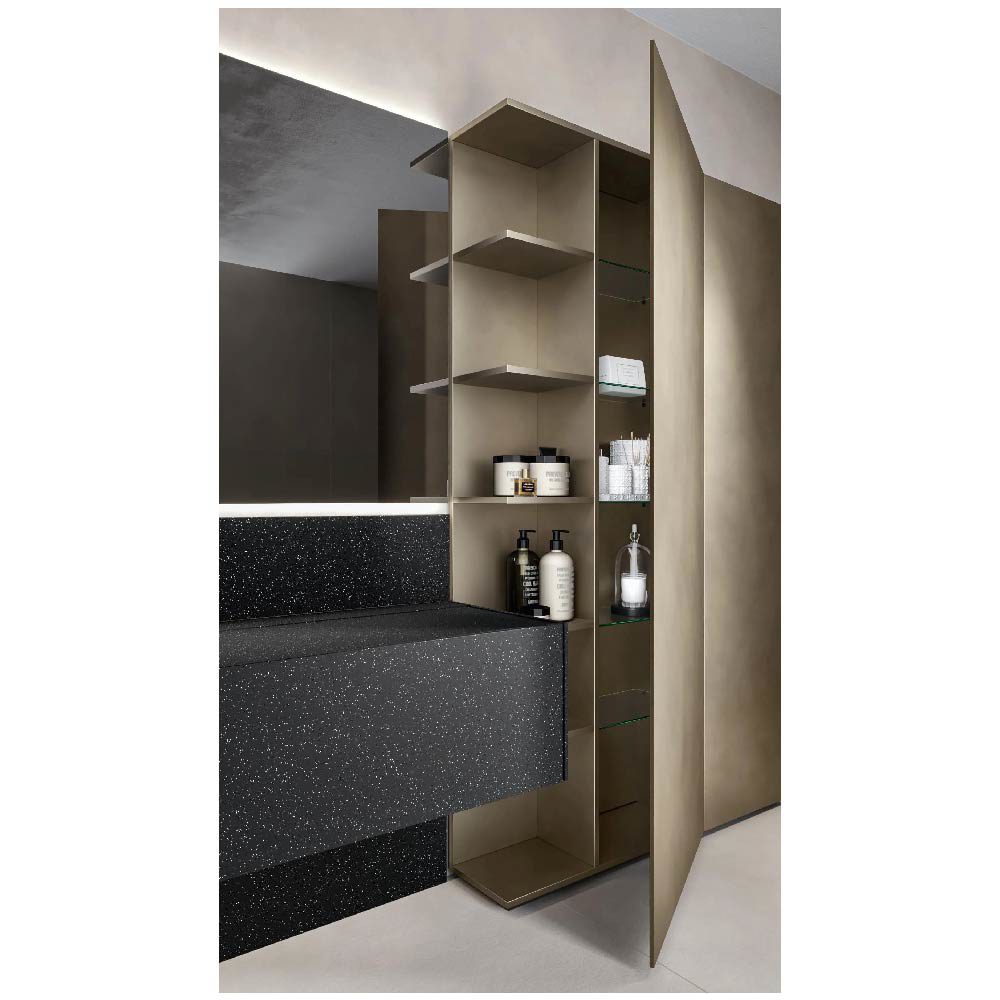 The pleasure of wide and continuous surfaces, without interruptions. A work of subtraction to minimize each possible line different than those defining the volumes of the units. Maxi doors, long fronts and nearly hermetic lines that laterally reveal refined games of heights and useful storage compartments. A versatile and pragmatic non-standard modularity. The free and interpretable use of the D.15.75" vanity units or the D.7.87" spacers emphasizes the role of the depth, which is at complete disposal to the furnishing creativity.