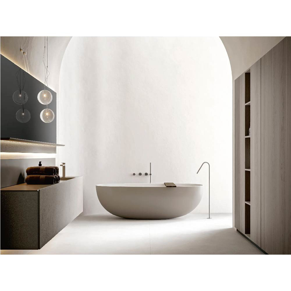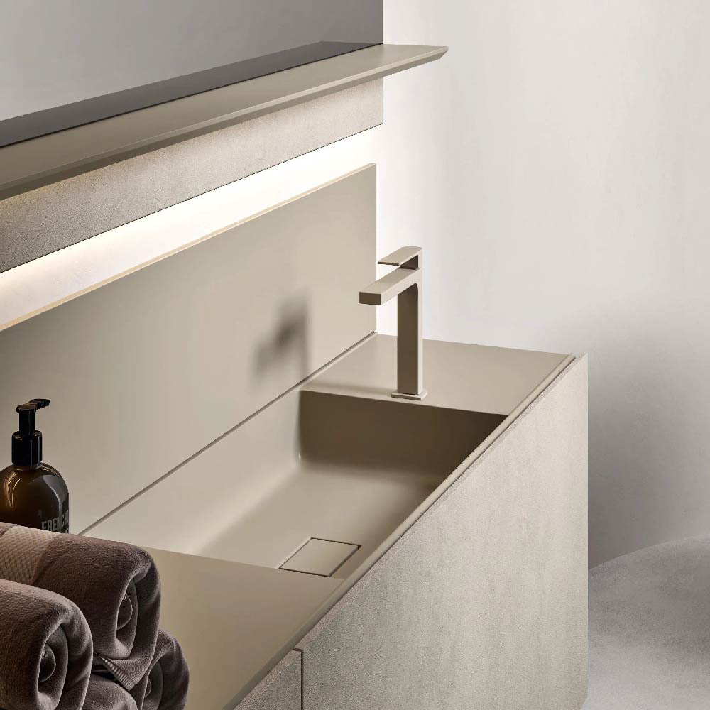 The pleasure of wide and continuous surfaces, without interruptions. A work of subtraction to minimize each possible line different than those defining the volumes of the units. Maxi doors, long fronts and nearly hermetic lines that laterally reveal refined games of heights and useful storage compartments. A versatile and pragmatic non-standard modularity. The free and interpretable use of the D.15.75" vanity units or the D.7.87" spacers emphasizes the role of the depth, which is at complete disposal to the furnishing creativity.