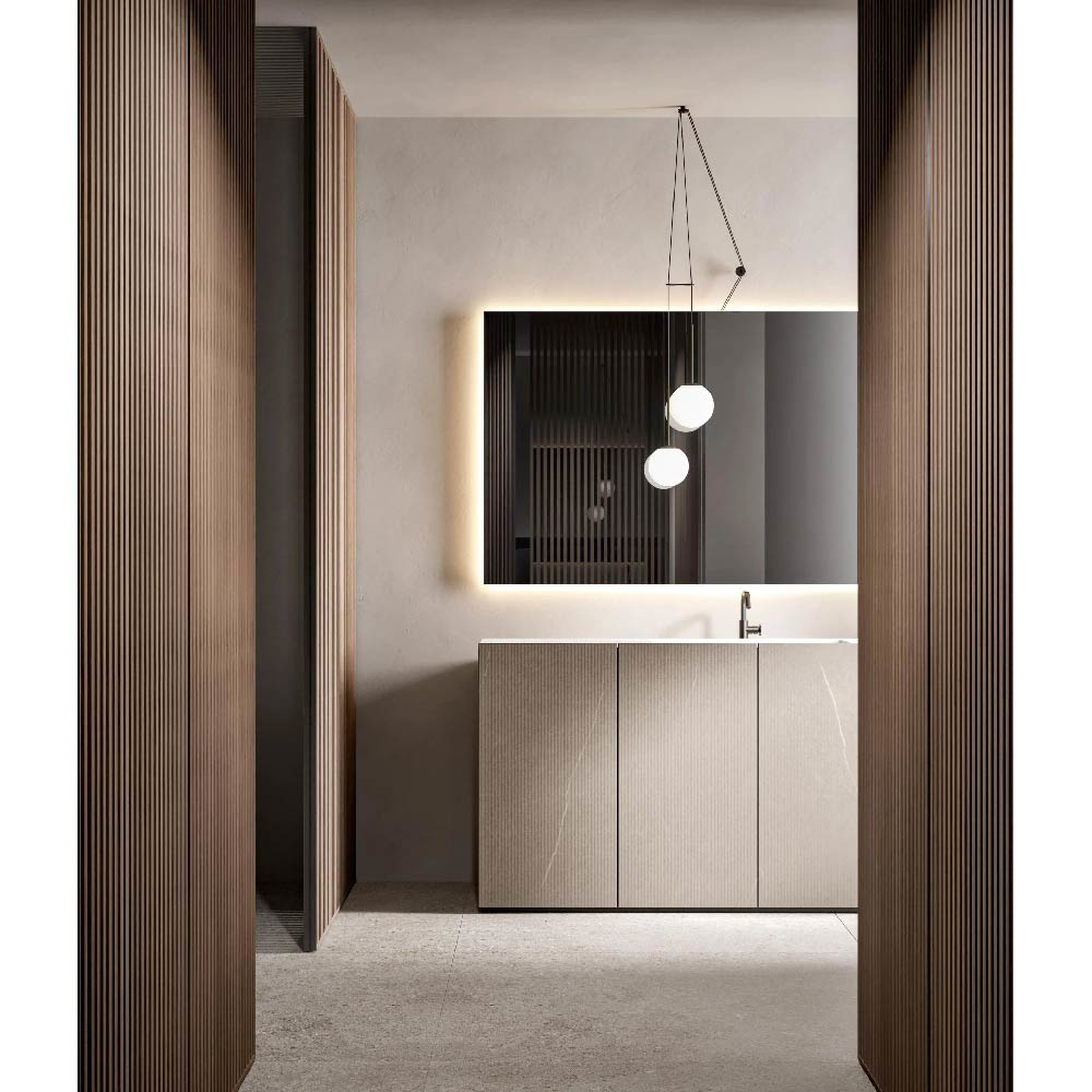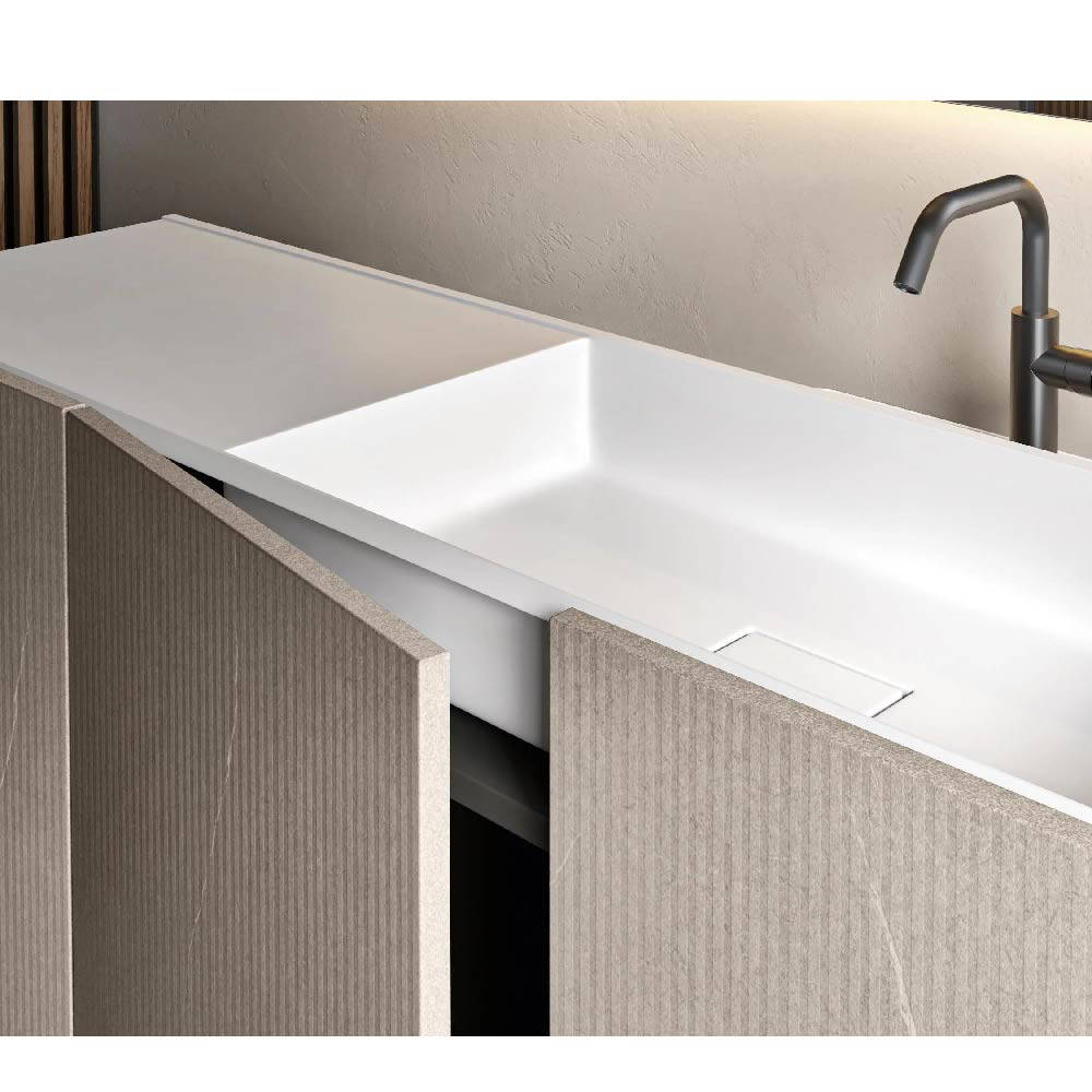 The pleasure of wide and continuous surfaces, without interruptions. A work of subtraction to minimize each possible line different than those defining the volumes of the units. Maxi doors, long fronts and nearly hermetic lines that laterally reveal refined games of heights and useful storage compartments. A versatile and pragmatic non-standard modularity. The free and interpretable use of the D.15.75" vanity units or the D.7.87" spacers emphasizes the role of the depth, which is at complete disposal to the furnishing creativity.