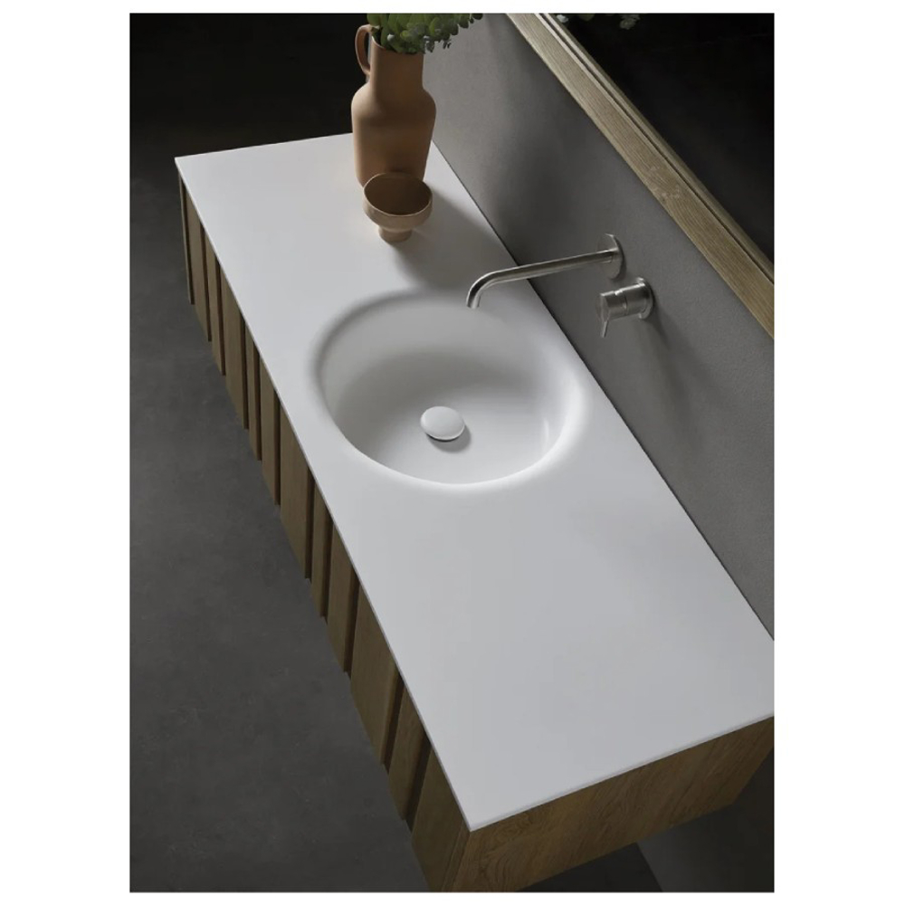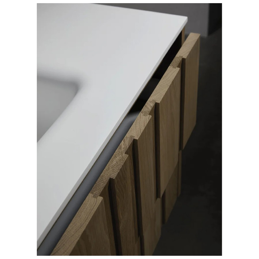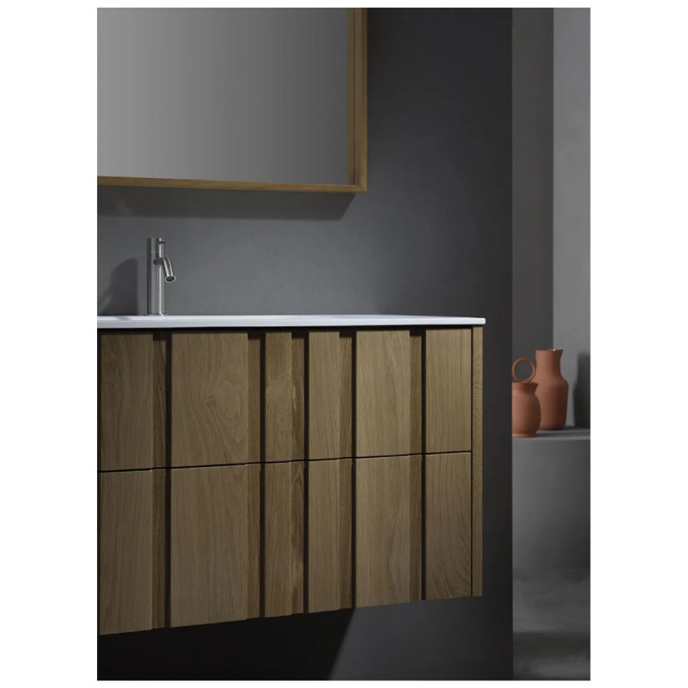 The Elenio designer bathroom furniture is distinguished by the sculpted grooves on the front of its drawers. This contemporary style solid wood vanity unit measures 51 cm deep. Its height of 34.5 cm or 53 cm depends on the bathroom furniture version chosen. With a custom width of 80 cm to 150 cm, the Igi vanity unit adapts to different bathroom dimensions.