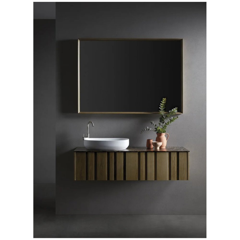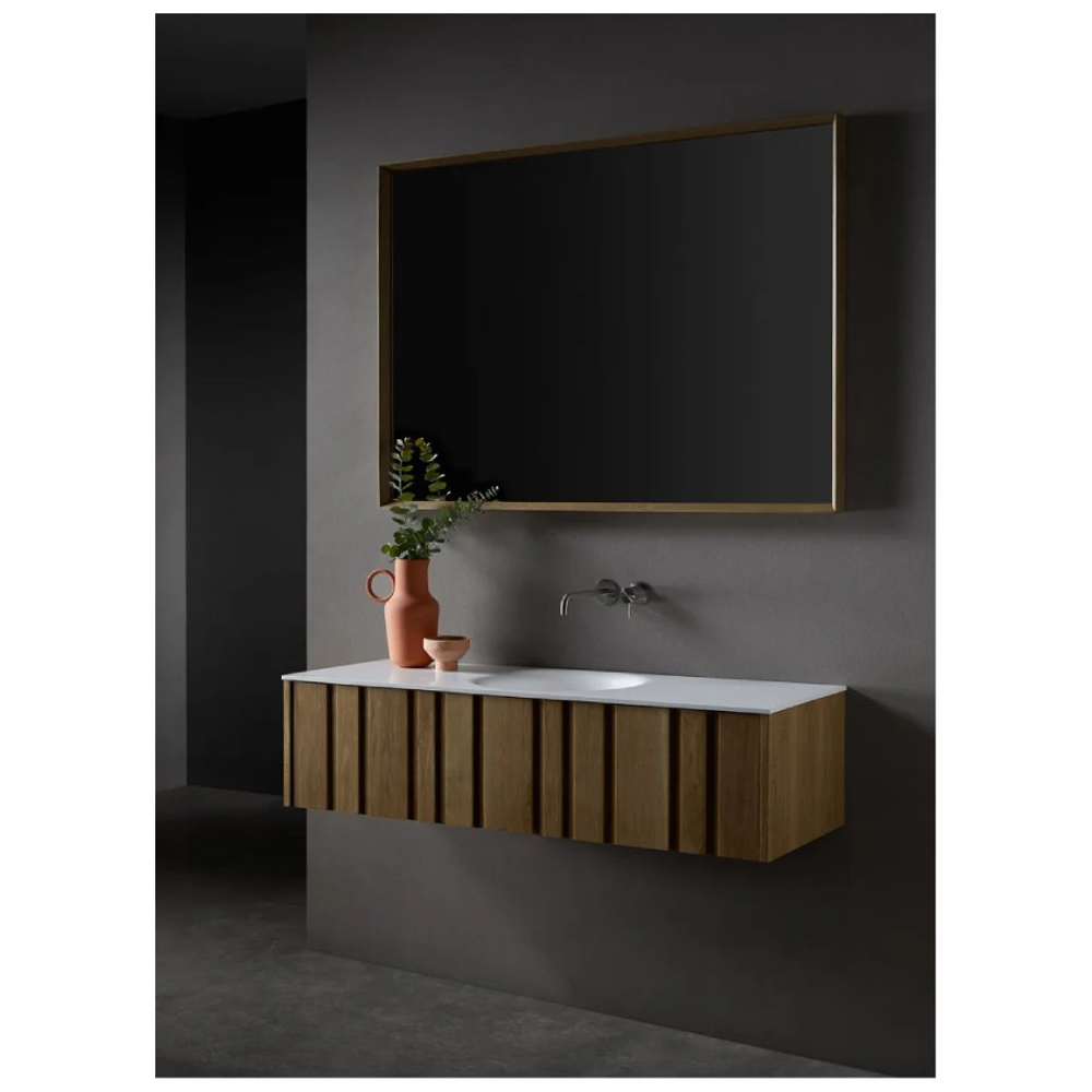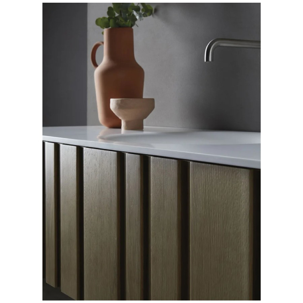 Materials and finishes for this designer vanity unit in natural wood