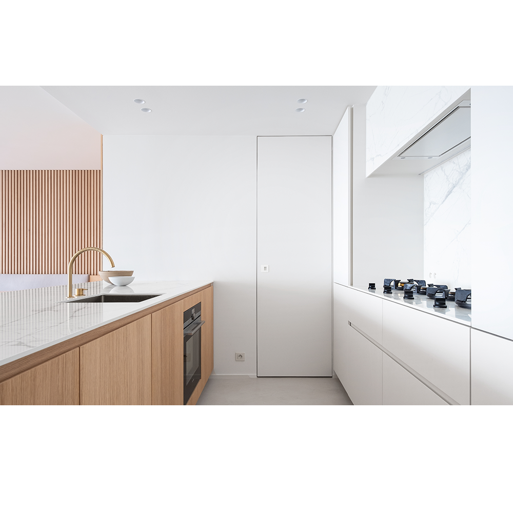 When painted in the same color as the wall, the frameless flush door becomes almost invisible, achieving a discreet architectural effect that enhances contemporary, minimalist, and luxury interiors.