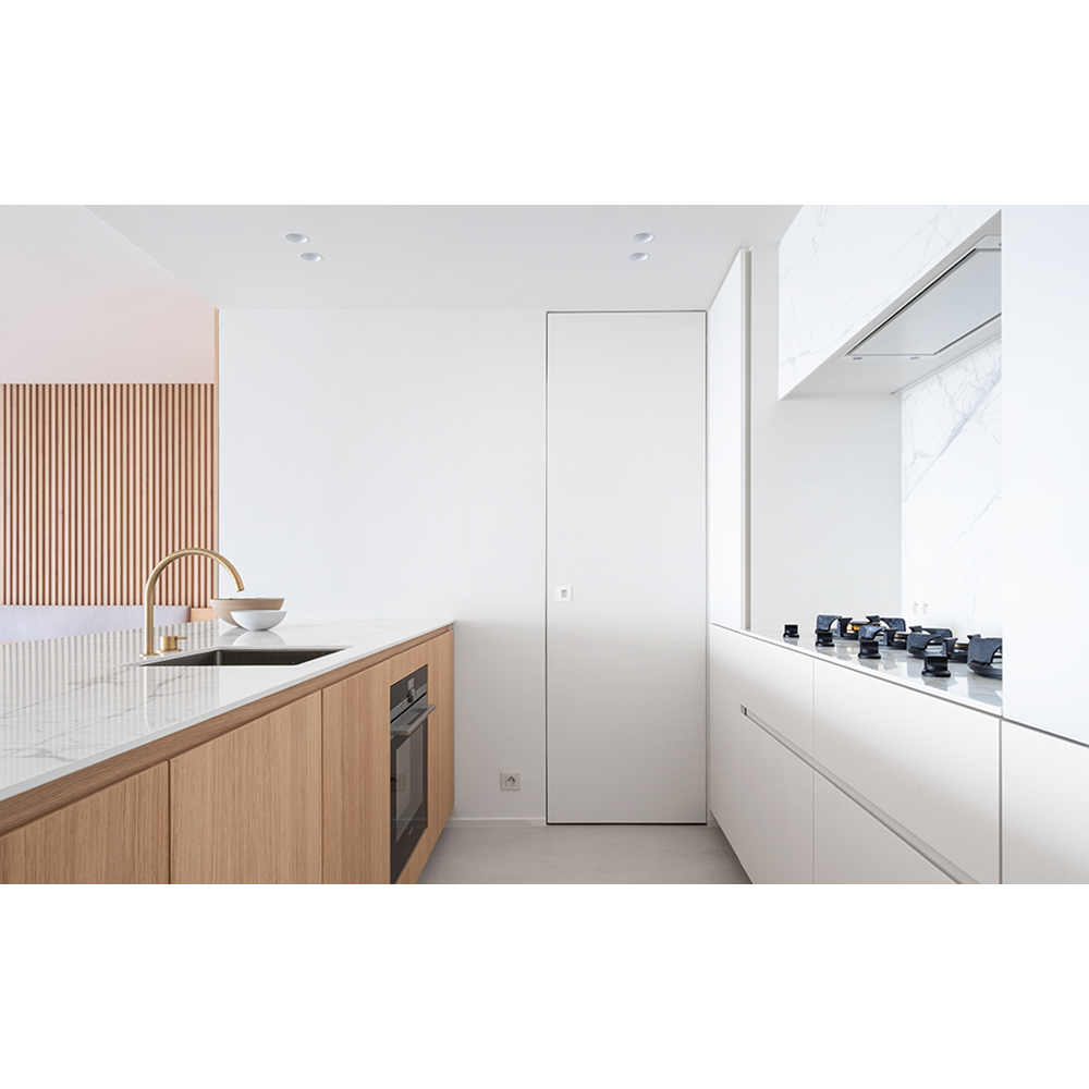 When painted in the same color as the wall, the frameless flush door becomes almost invisible, achieving a discreet architectural effect that enhances contemporary, minimalist, and luxury interiors.