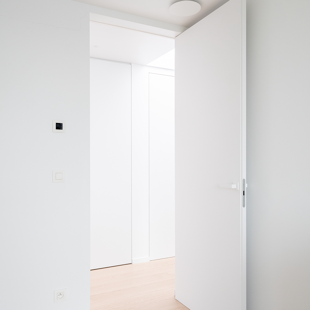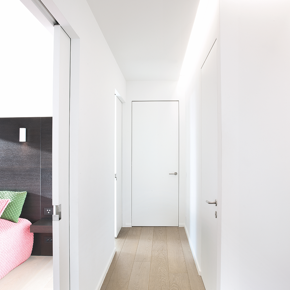 When painted in the same color as the wall, the frameless flush door becomes almost invisible, achieving a discreet architectural effect that enhances contemporary, minimalist, and luxury interiors.