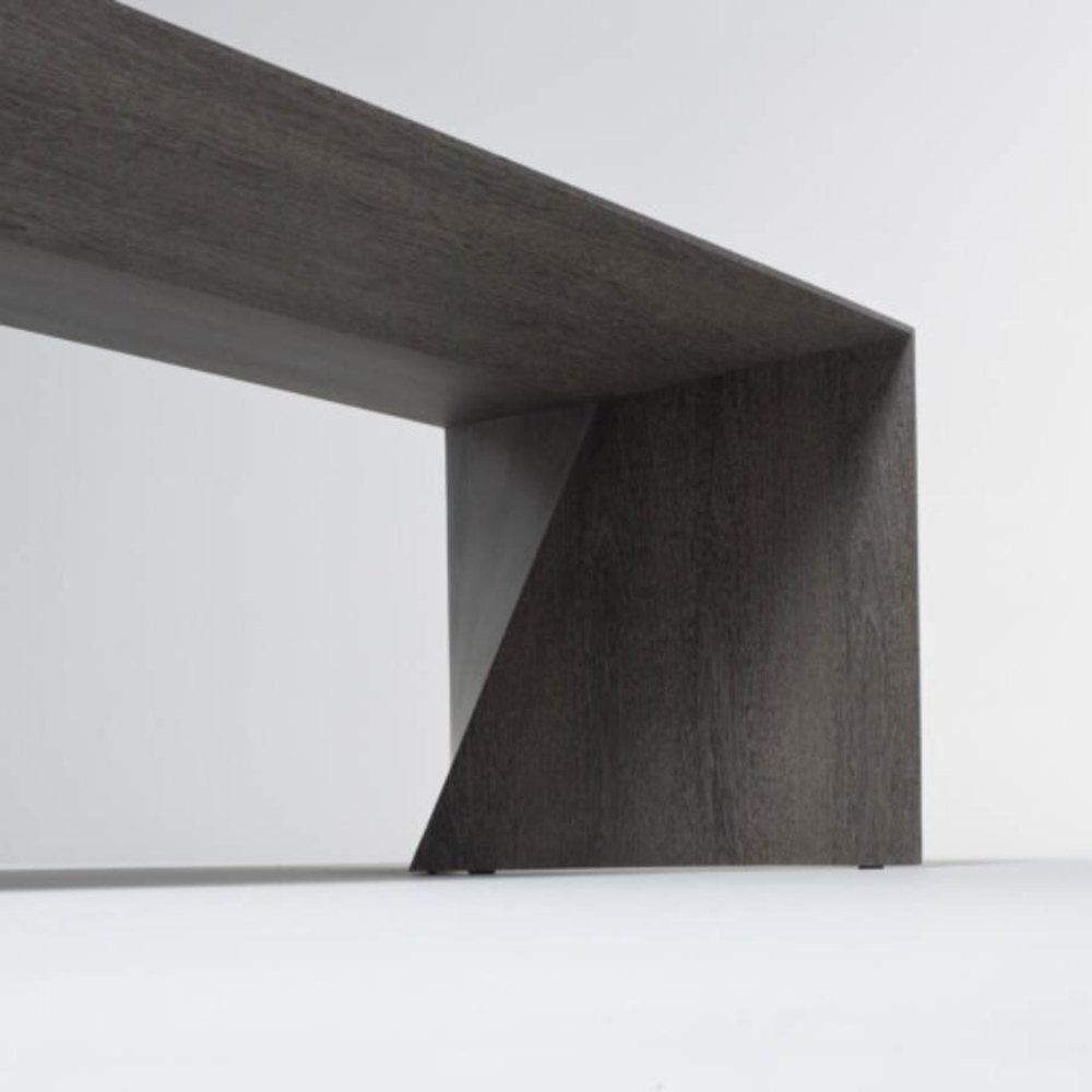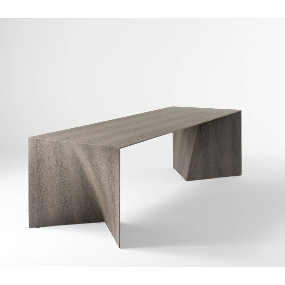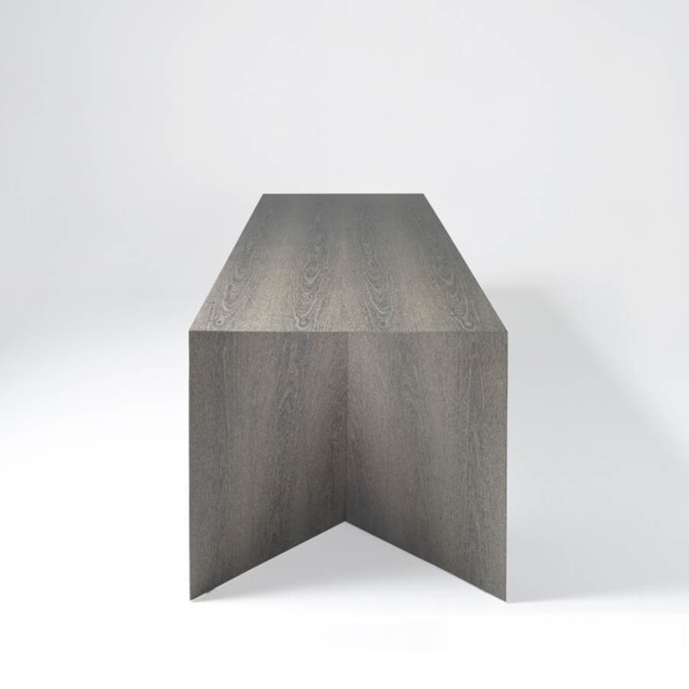 Table made of plywood and surface finish in different essences. The base, in the shape of a hyperbole, develops on a thin profile which, changing along the perimeter, becomes flat.