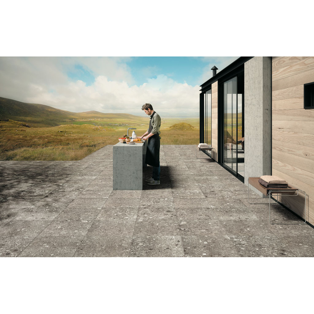 Porcelain surfaces become tactile and a harmoniously irregular grain becomes the focus. Pebbles of varying colors and shapes create pleasant three-dimensional effects, breathing life into surfaces with a natural yet contemporary surface in Norr, the new Italian porcelain tile collection. This stone-effect collection can even be installed outdoors. The structured finishing has an "old" look, making this collection the ideal solution for balconies and gardens. A material with a distinctive harmoniously random texture, with pebbles of different colors and size and shade-on-shade hues with a 3D effect. A unique project, where natural elements are reinterpreted in a creative way according to contemporary planning needs. Features a stone-effect look with all the characteristics of 2cm porcelain stoneware. It is also available for matching Indoor application in different colors and sizes.