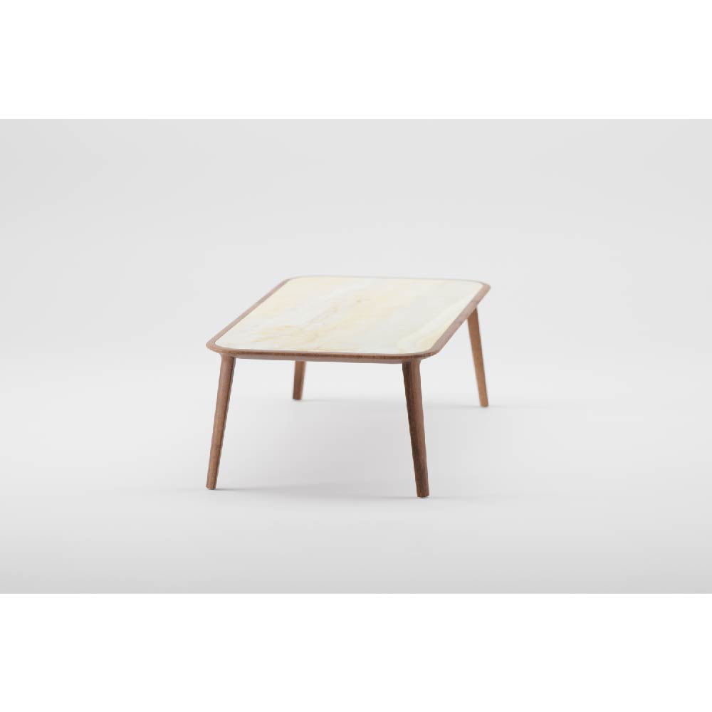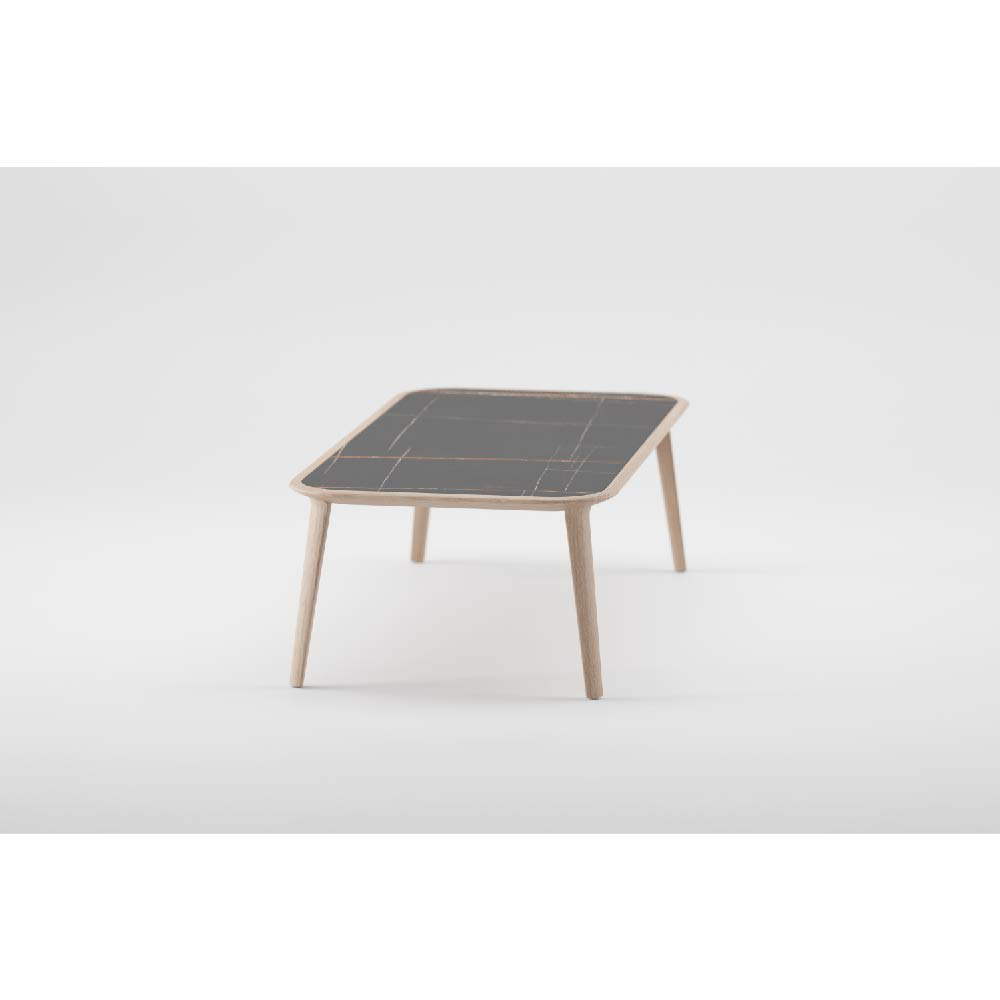A subtle association to the spherical form, to a segment of this perfect shape, is immersed in the warmth of wood, in a curved Mould, like a negative embracing a body. The piece is completed by a flat surface with a contrasting tone and texture, ceramic or leather inserts, trimmed with wood, like an elegant cross-section, a calotte surface. The functional horizontal place remains visually accentuated by means of the material’s aesthetic sensations, textures in seductive light and dark versions, accompanied by the imperative of the tactile, of touch.
