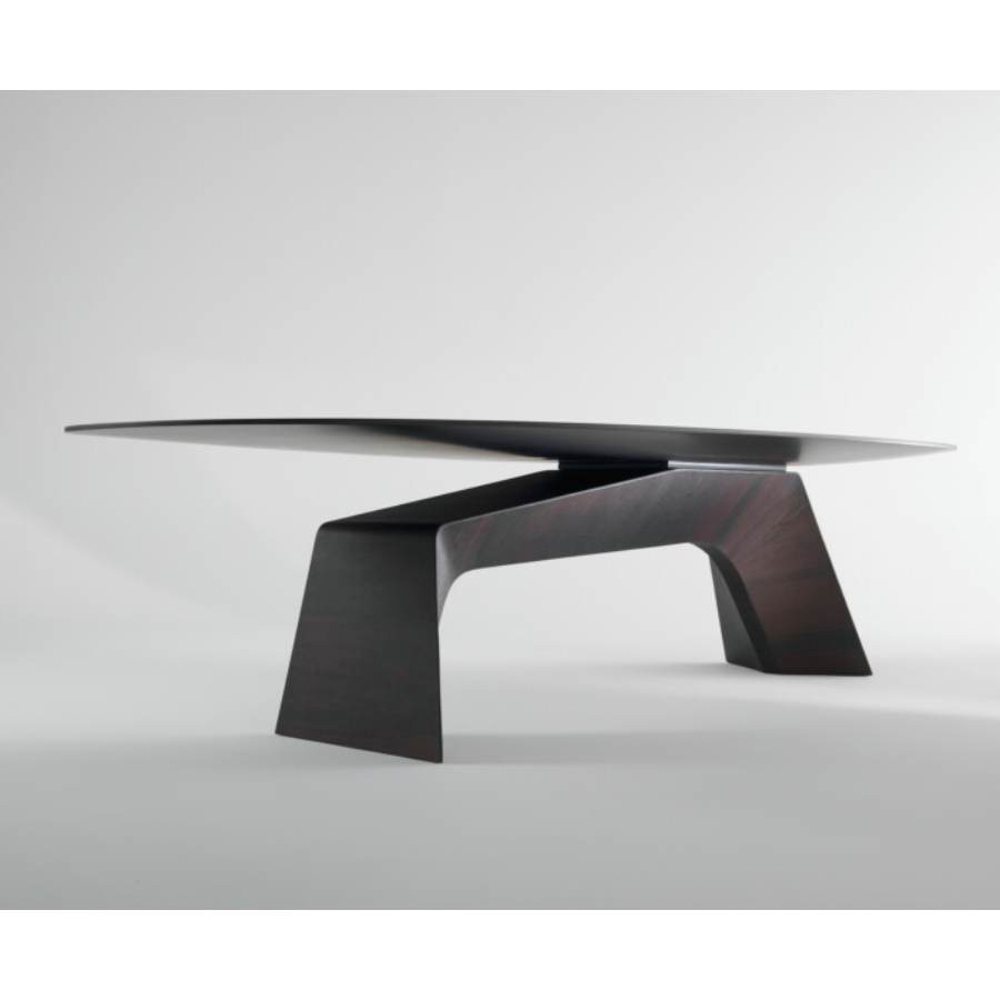 Kintai is a sculptural table with a strong visual impact, characterized by a game of balance between the elements that make it up. A true domestic architecture that evokes the oriental world and the theme of Zen balance. A balance that is not only static but also formal. The massive, solid, imposing base is contrasted with a thin, elegant, floating top. Still and moving at the same time, Kintai is an expression of Zen balance.