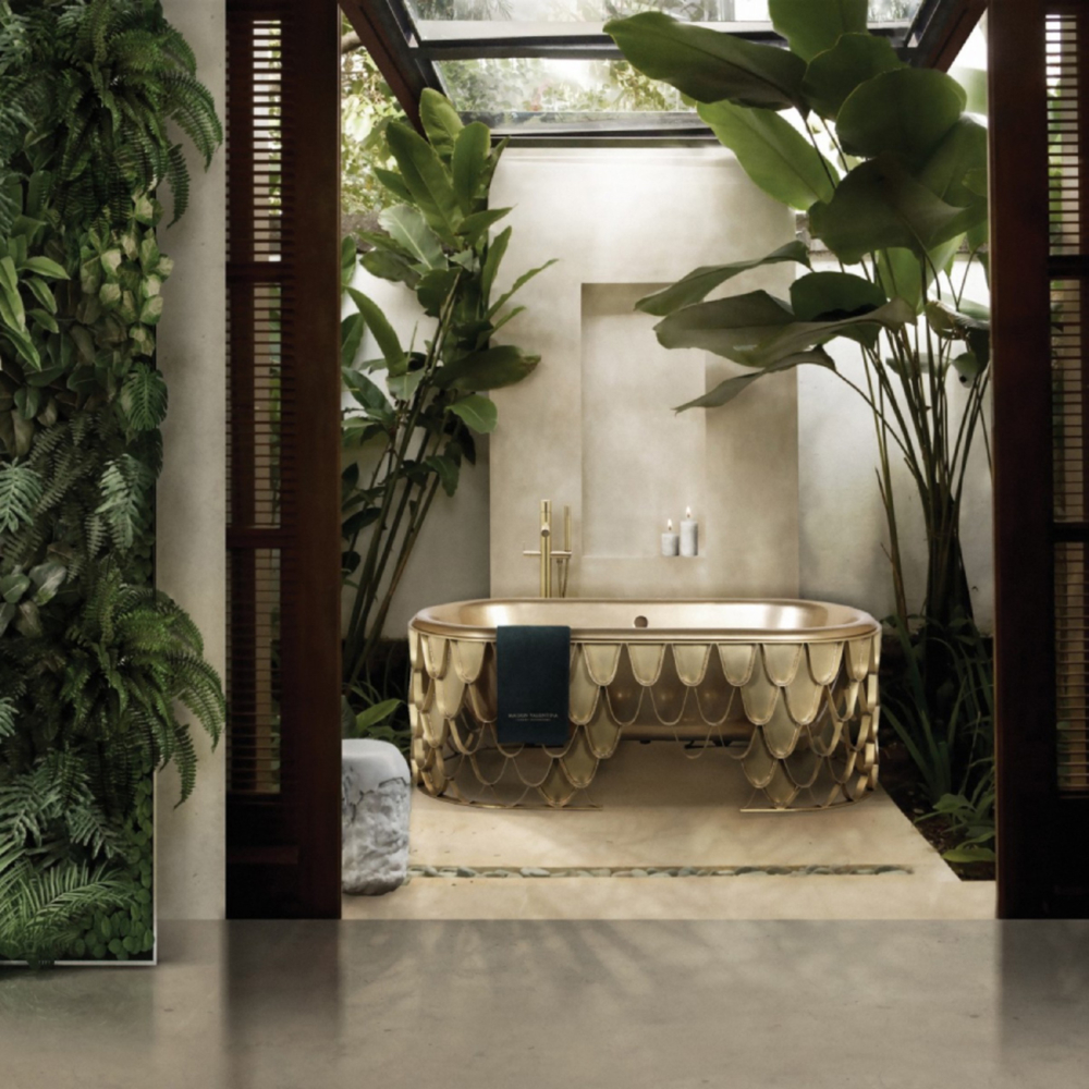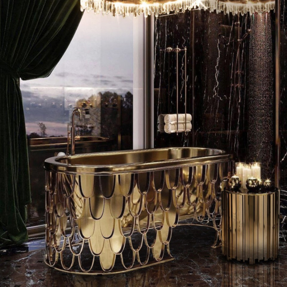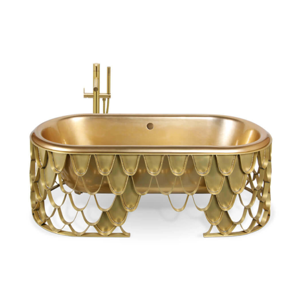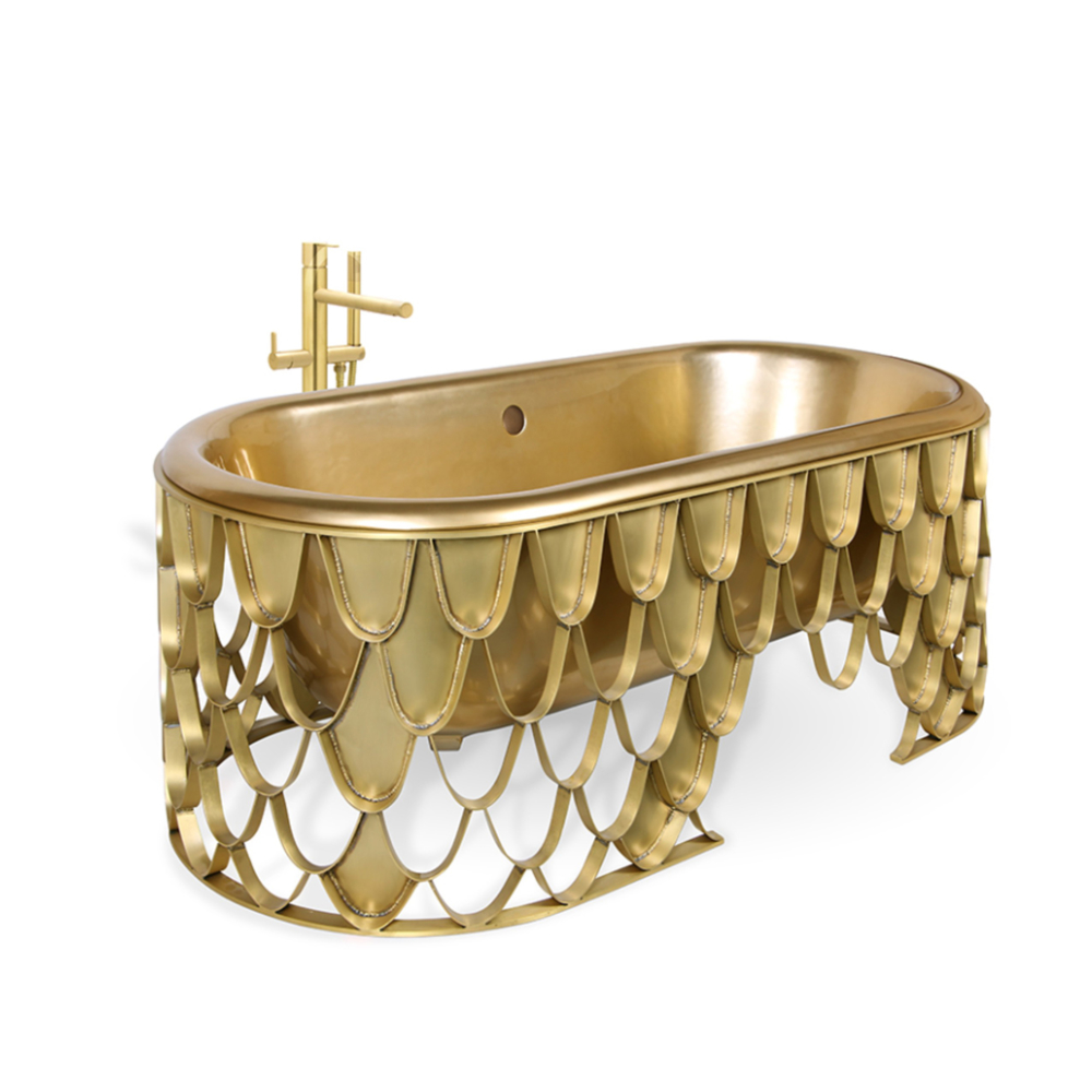 DESCRIPTION The Koi bathtub features an aged brushed brass base resembling the scales pattern of the Japanese Koi carp. The contrived patina iron tub has an oval shape and a curved lip, making it the perfect resting spot for your head. The name of this contemporary bathtub and the Japanese word for love are homophones, making the carp a symbol of love and affection.