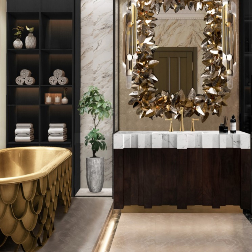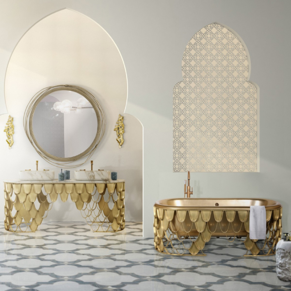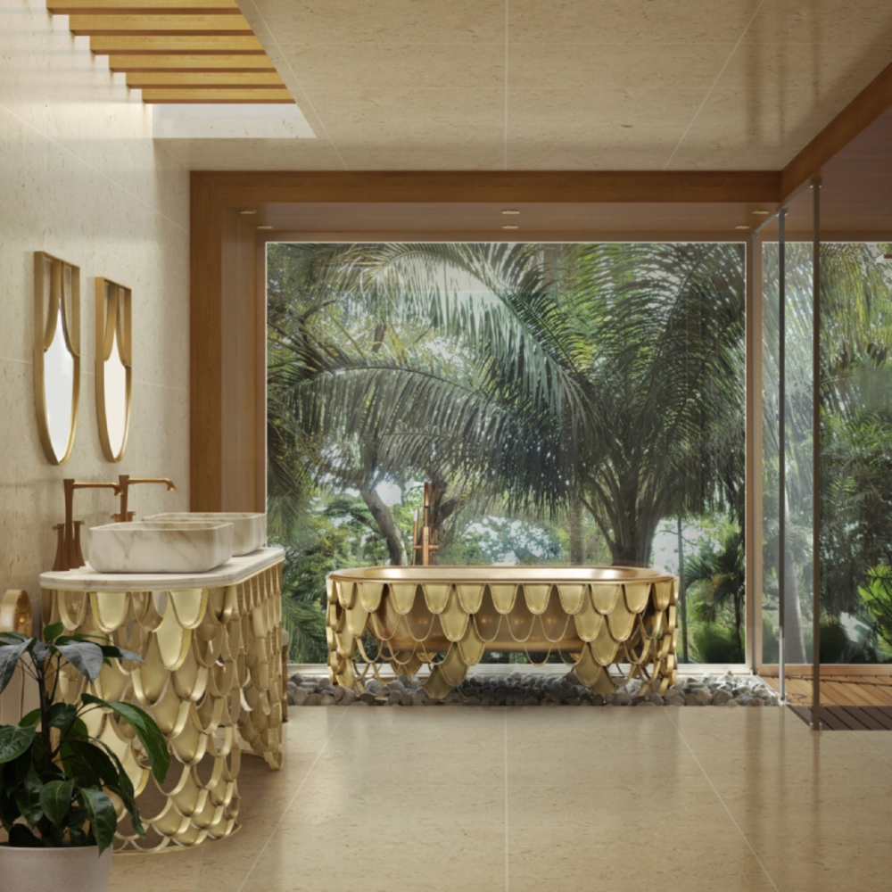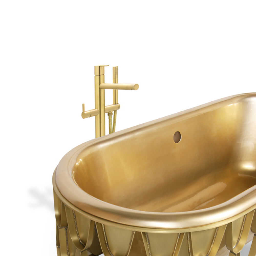 Structure: Brushed Brass Matte, Matt Varnish; Tub: Casted Iron, Gold painted, High gloss varnish; Water drainage: Floor