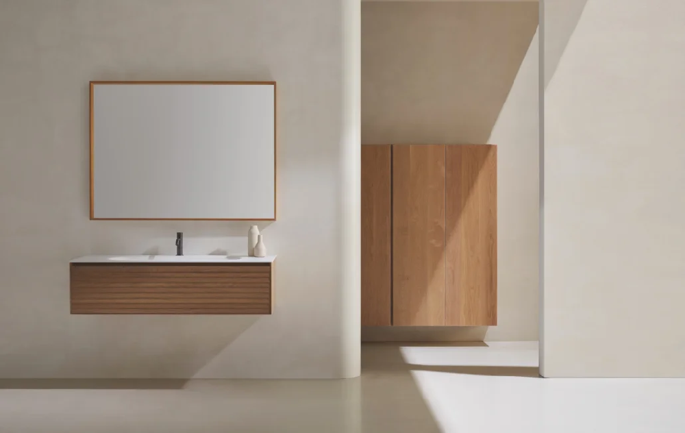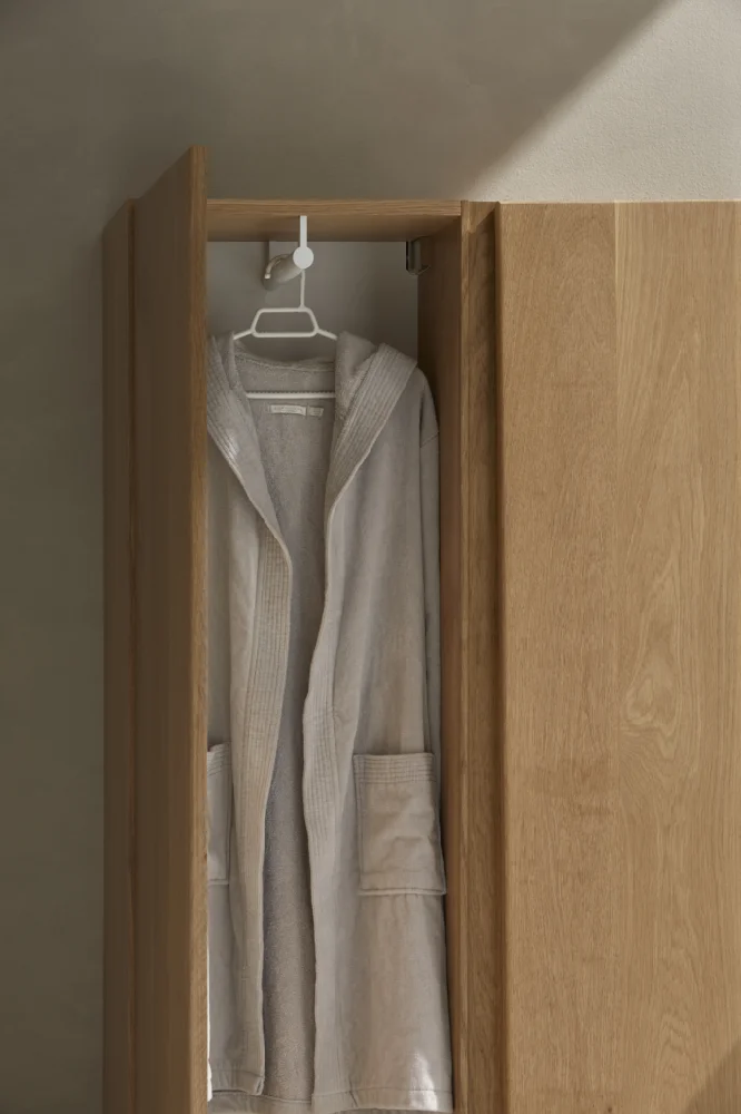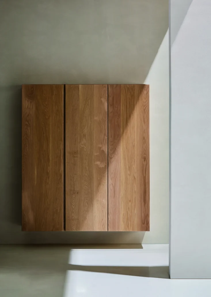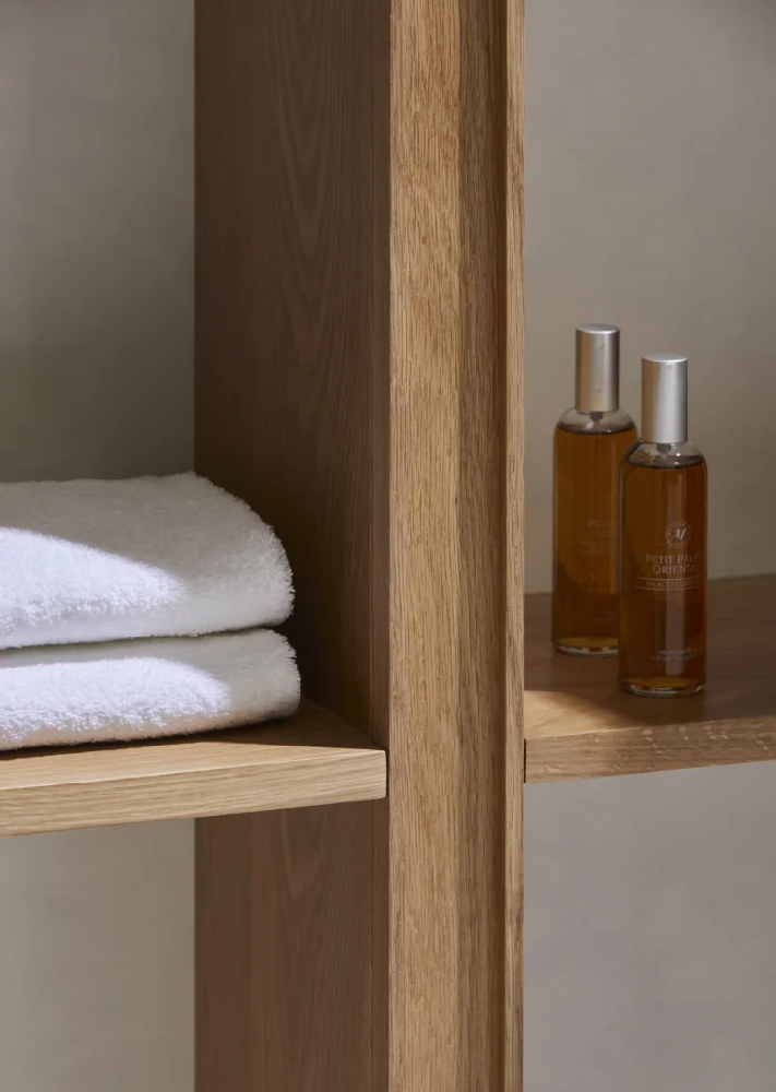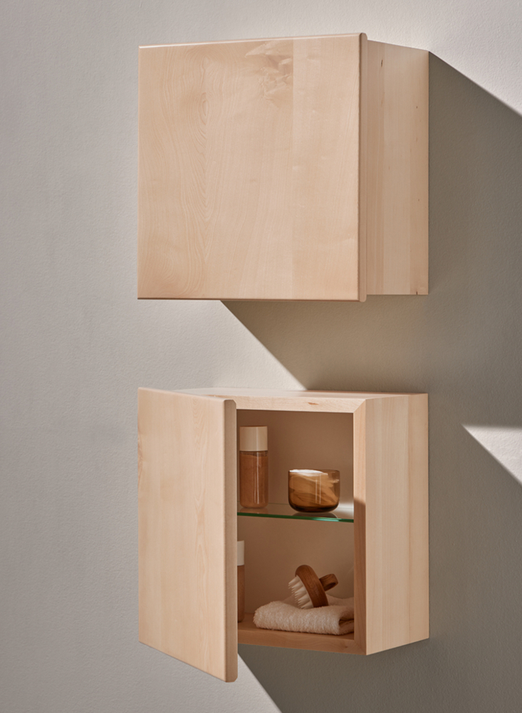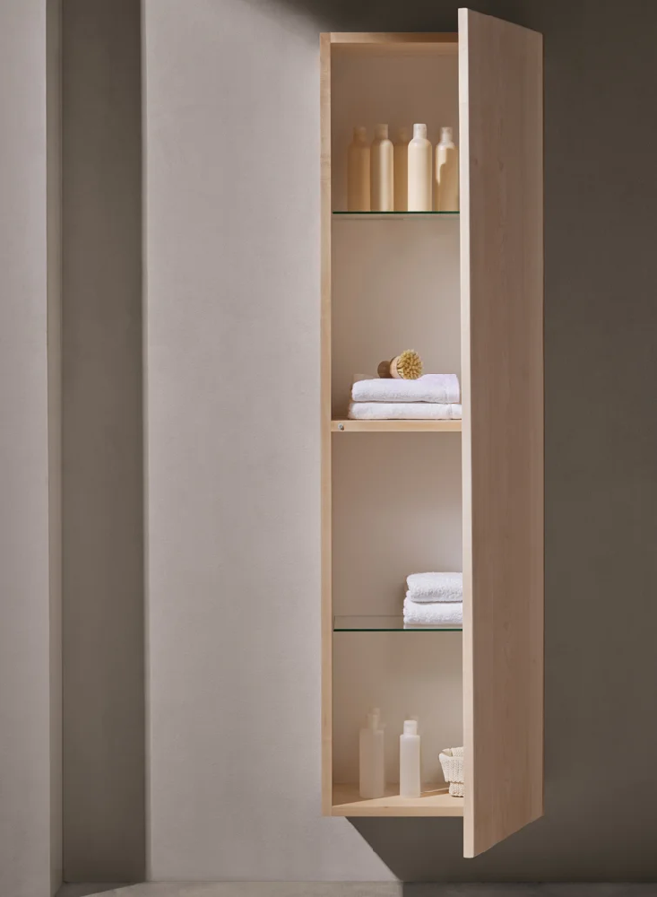 Kondo is a column system designed to optimize the storage of all the bathroom products, minimizing the space used in the bathroom. It was an essential requirement for the design to be neutral, in order to be used in harmony with other bathroom furniture and accessories. It is made of modules for storage in height, which allows us to optimize better the space. Without handles, a Gola-type system has been designed for the interior, and is made in solid wood or lacquered depending on the chosen version. The doors have a pull or push opening system depending on the composition. Manufactured in all the solid woods of our catalogue, and in all shades and textures in its lacquered version to make the Kondo a basic in our bathrooms.