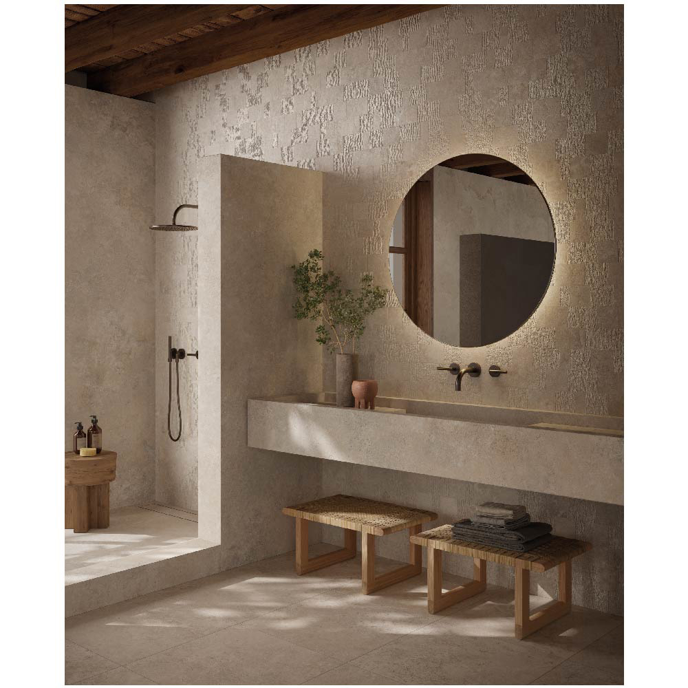 Travertine, with its warm and delicate beauty, lies at the heart of the Nativa collection — a dialogue between the natural universe and the human dimension that gives rise to a timeless material bringing simple elegance to contemporary spaces.