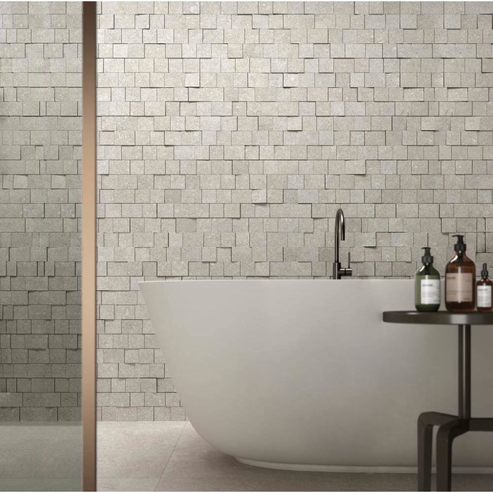 With its blend of natural stone effect, textured surfaces, and high-performance porcelain stoneware, the Reverse series is ideal for creating coordinated design projects with a strong architectural identity.