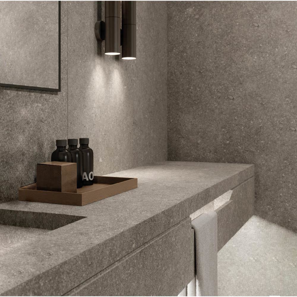 With its blend of natural stone effect, textured surfaces, and high-performance porcelain stoneware, the Reverse series is ideal for creating coordinated design projects with a strong architectural identity.
