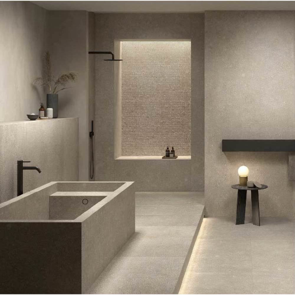 With its blend of natural stone effect, textured surfaces, and high-performance porcelain stoneware, the Reverse series is ideal for creating coordinated design projects with a strong architectural identity.