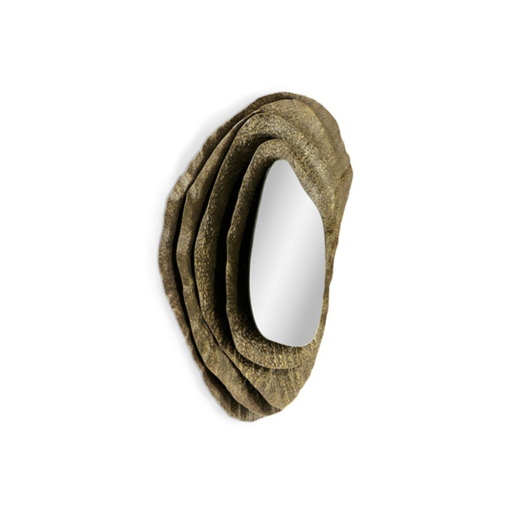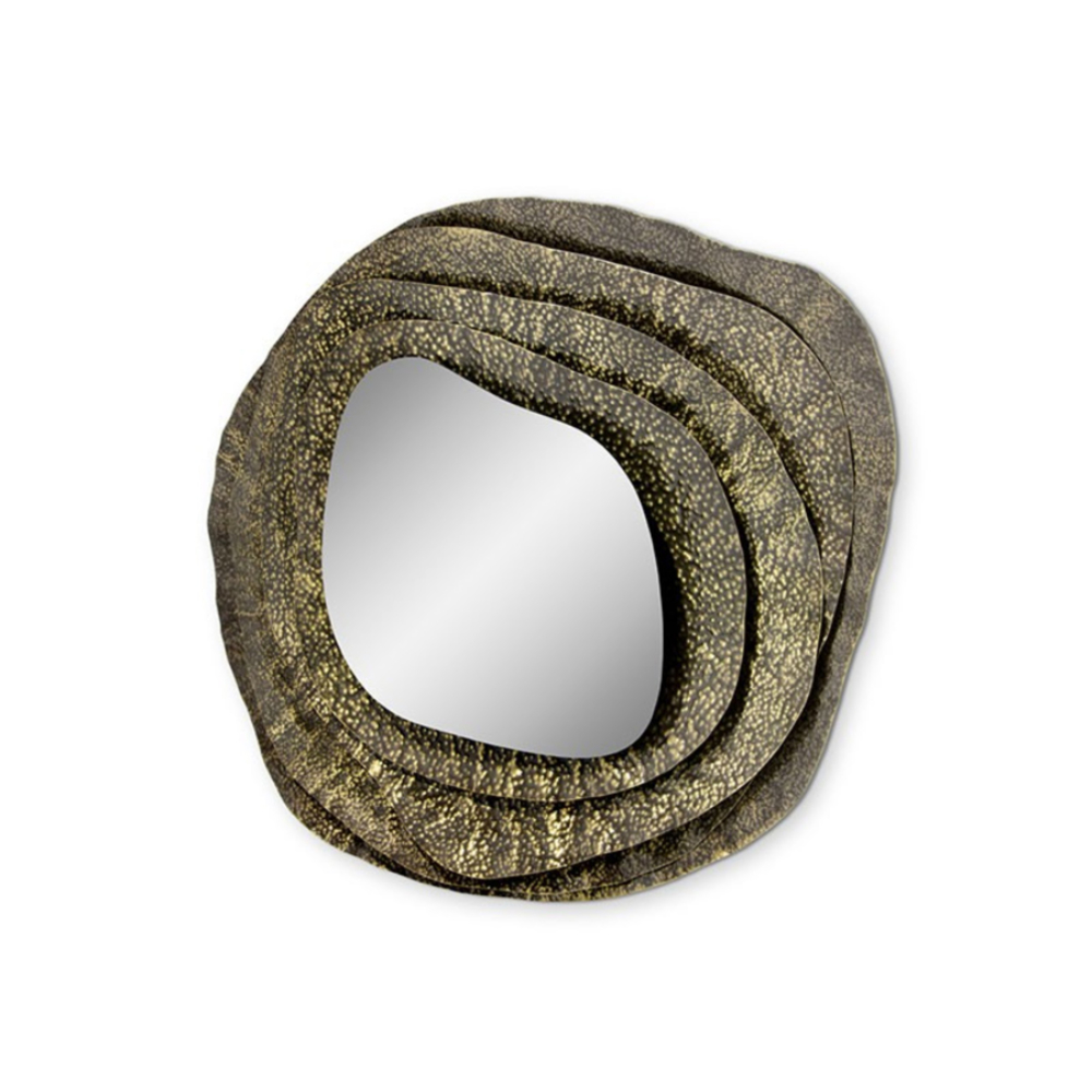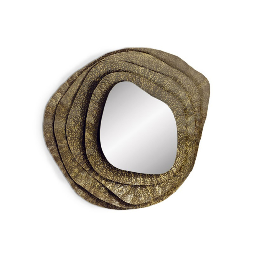 DESCRIPTION With origins in Japan, Kumi is an oyster with undeniable beauty. Kumi Mirror II pays tribute to its allure through its glossy hammered aged brass. This decorative round wall mirror is a treasure coveted by many and the most stylish and perfect item to own in any luxury bathroom interior design creating a perfect Oasis feel.